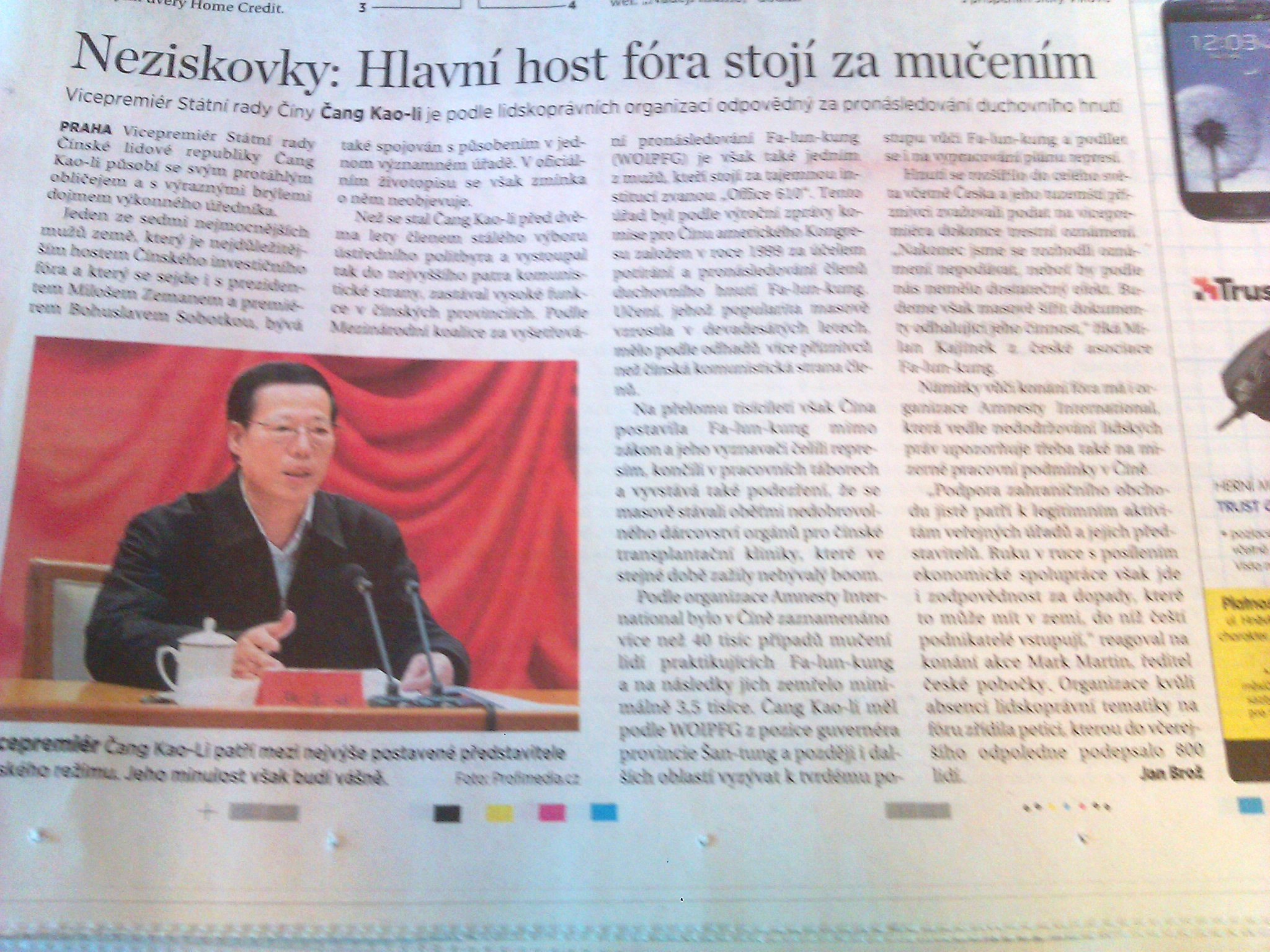 捷克电视台在关于这次中国投资论坛的报道中说,“据称,张高丽对法轮功学员的被抓捕和遭受酷刑负有责任”。