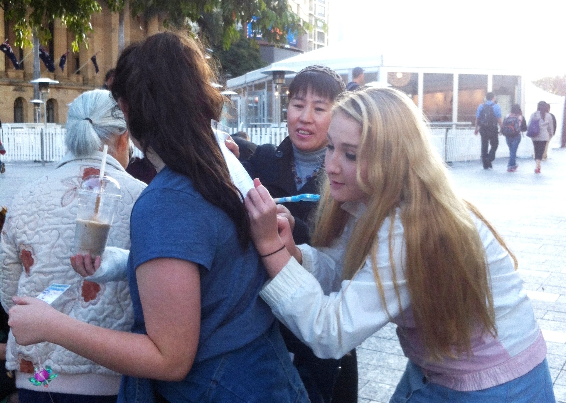 一个西人男孩走过来向学员比了个大拇指,说:“你们做得好!” “中共政府很坏”。这名男孩对中共迫害法轮功学员的暴行非常愤恨,他接着说:签一个名不够,我要签两个名来制止中共的恶行。学员感谢他的好意并向他解释,依照澳洲法律规定,请愿书上每个人只能签一次名。男孩听后表示,他明白,但是他的心真的是对中共的所为感到非常生气,希望加倍支持法轮功。