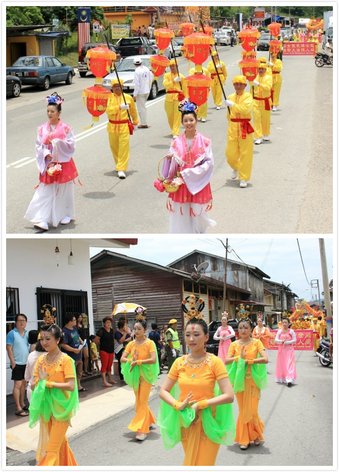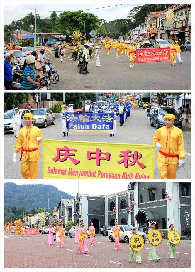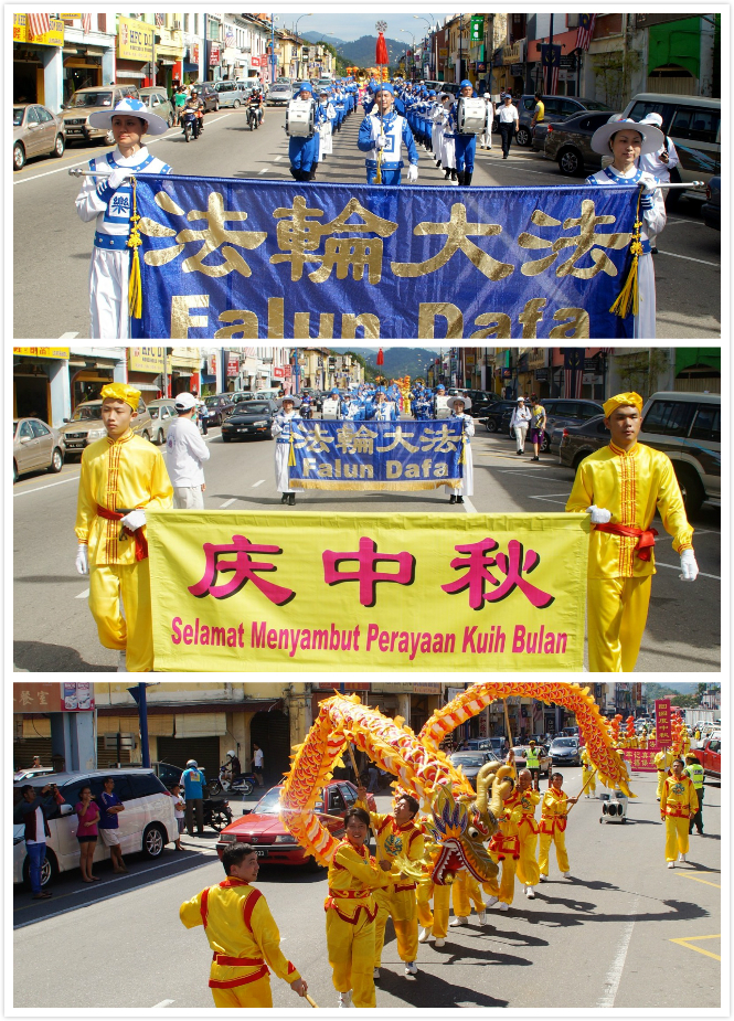 九月六日下午,法轮功学员来到位于彭亨州西部,距离首都吉隆坡约一百一十公里,已有超过百年历史,马来西亚最古老的市镇之一的劳勿(Raub)举行第一场的中秋游行。身着蓝白色中国历史上传统宫廷乐团服饰的天国乐团,演奏着一首接一首震撼人心的乐曲,在警方与志愿警卫队协助开路下,引领整个游行队伍浩荡出发。紧接在后的有身着金黄色传统服装的灯笼队伍、散发着古典韵味的仙女队、以及活灵活现的舞龙队伍。长长的队伍最后方阵是传统腰鼓队的表演,轻快的咚咚鼓声、传递着祥和与喜庆,途经劳勿市区主要大道和华人集中区,所到之处让人们感受到了法轮大法所带来的美好气息。