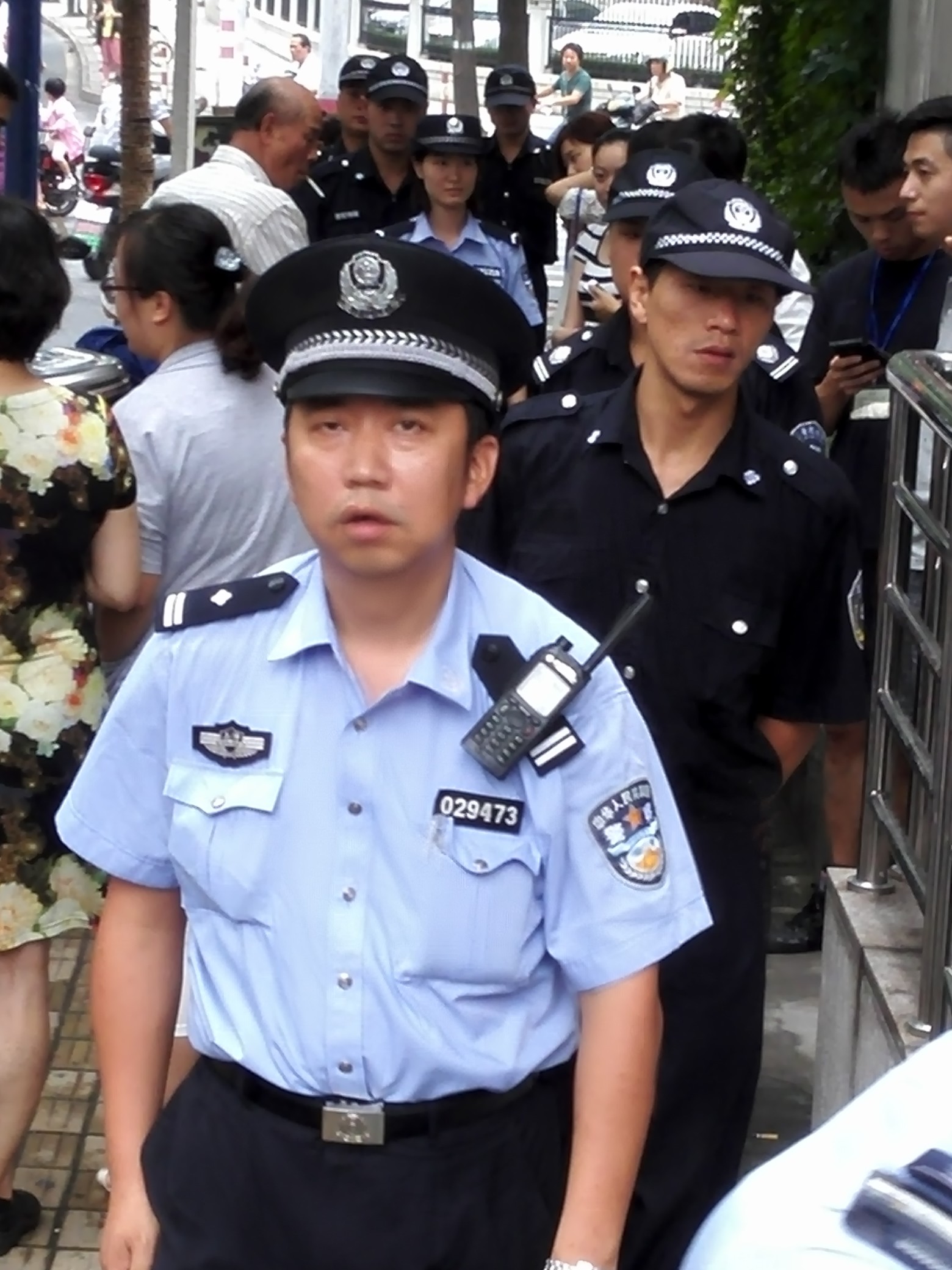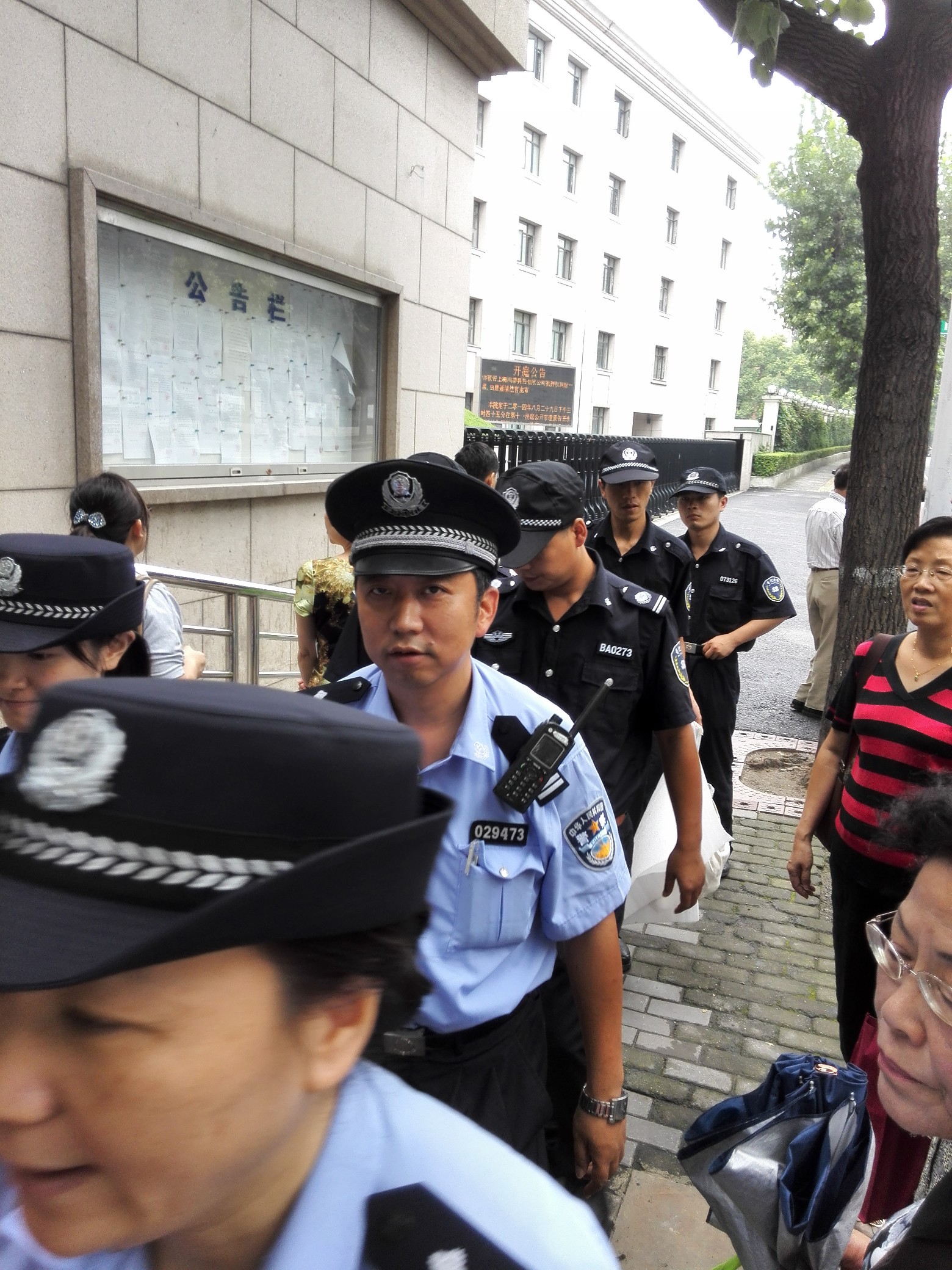 法院审理过程完全被普陀区“610”所操纵。当天,普陀区“610”直接在法院门口现场指挥、布置人手,国保便衣、法警、特警、特保(辅警)、街道居委全部出动,布满法庭内外。警车、特警车、黑色国保便衣车辆随处可见,法院门口与马路对面,一群便衣手持摄像机到处拍摄。