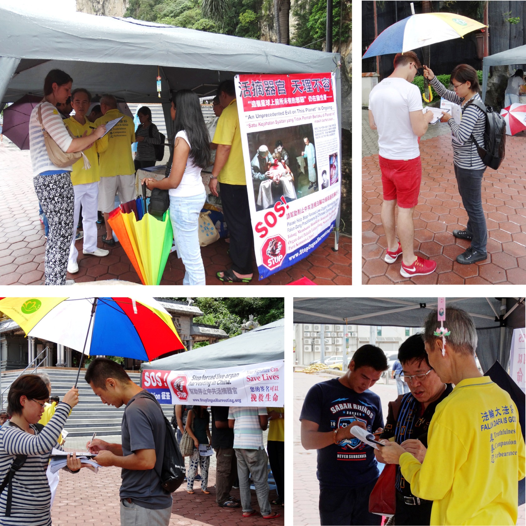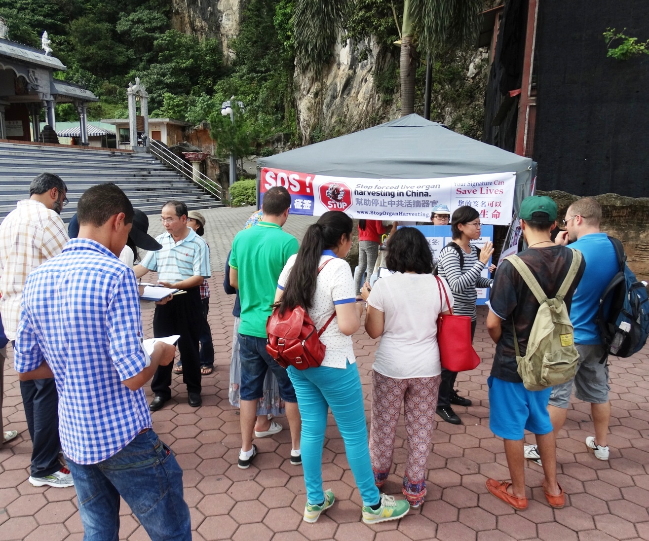 一名时常来黑风洞给猴子喂食的当地印裔男士,当天看到法轮功学员正在做征签,他站着看横幅看了很久、很入心。他跟学员透露,最近有人在脸书(facebook)传发关于中共活摘法轮功学员器官讯息,当时他看了有关讯息和了解真相后感到很伤心、很心痛,还哭了满脸的泪水。他问学员有什么他可以帮忙的吗?学员说,希望他能够签名制止中共恶行,也把相关讯息传达给更多的人知道。他签了名之后,还叫他的朋友也一起来签名。