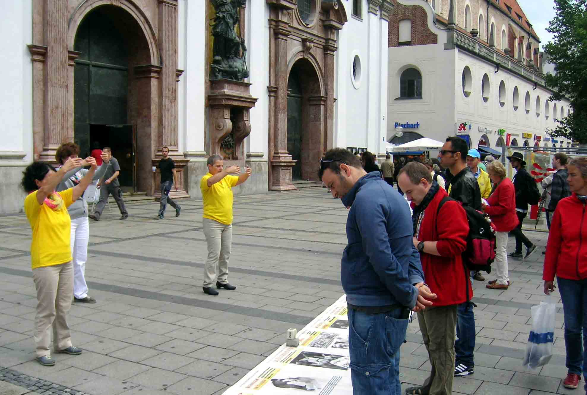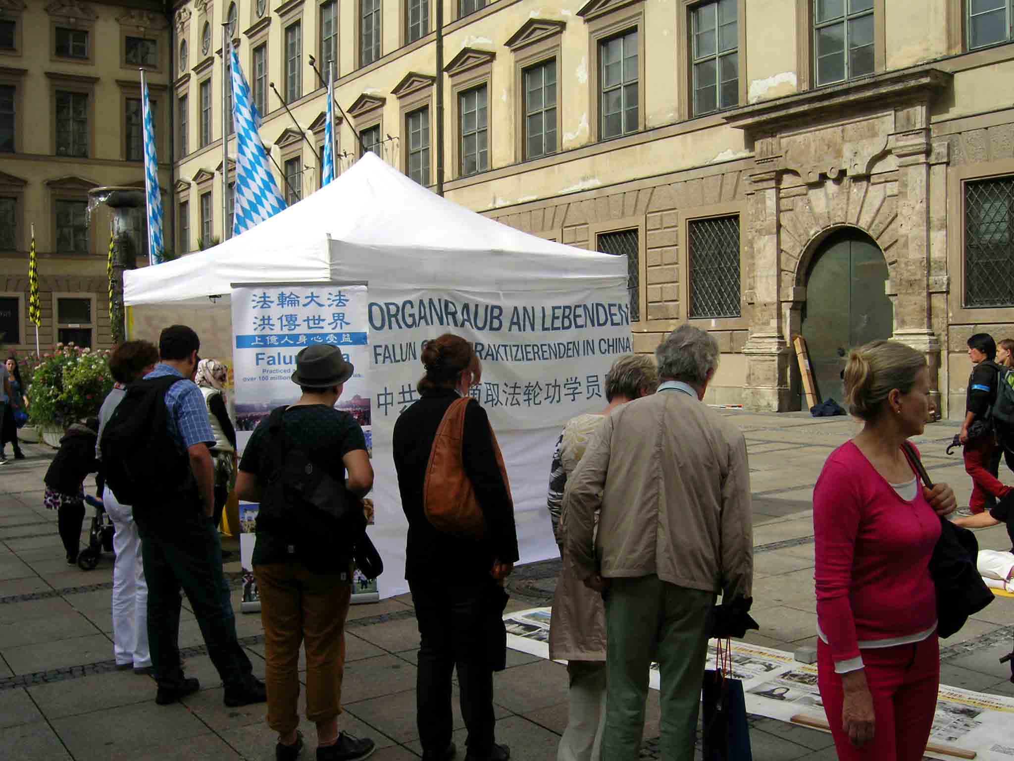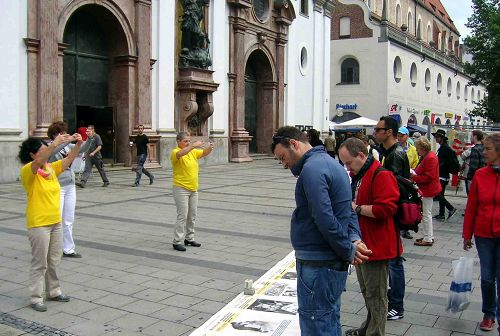 在慕尼黑另一个中国大陆游客常常出现的景点上,也每天都有法轮功学员讲真相。一位老年法轮功学员介绍说,现在很多中国人主动要资料,也有人很佩服法轮功学员,做完退出中共各种组织的手续后,拉着她的手直说谢谢,并祝她身体健康。在慕尼黑啤酒节开幕的这一天,就有十多个中国人在她那里做了三:退.。