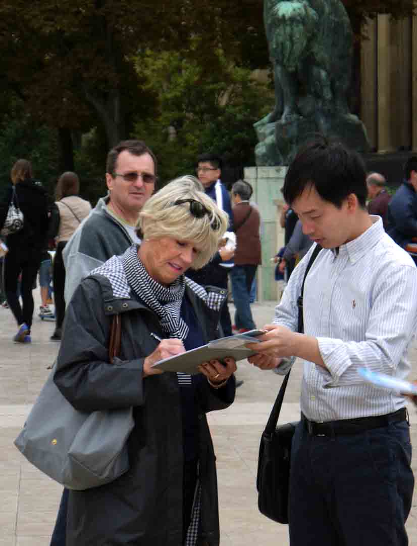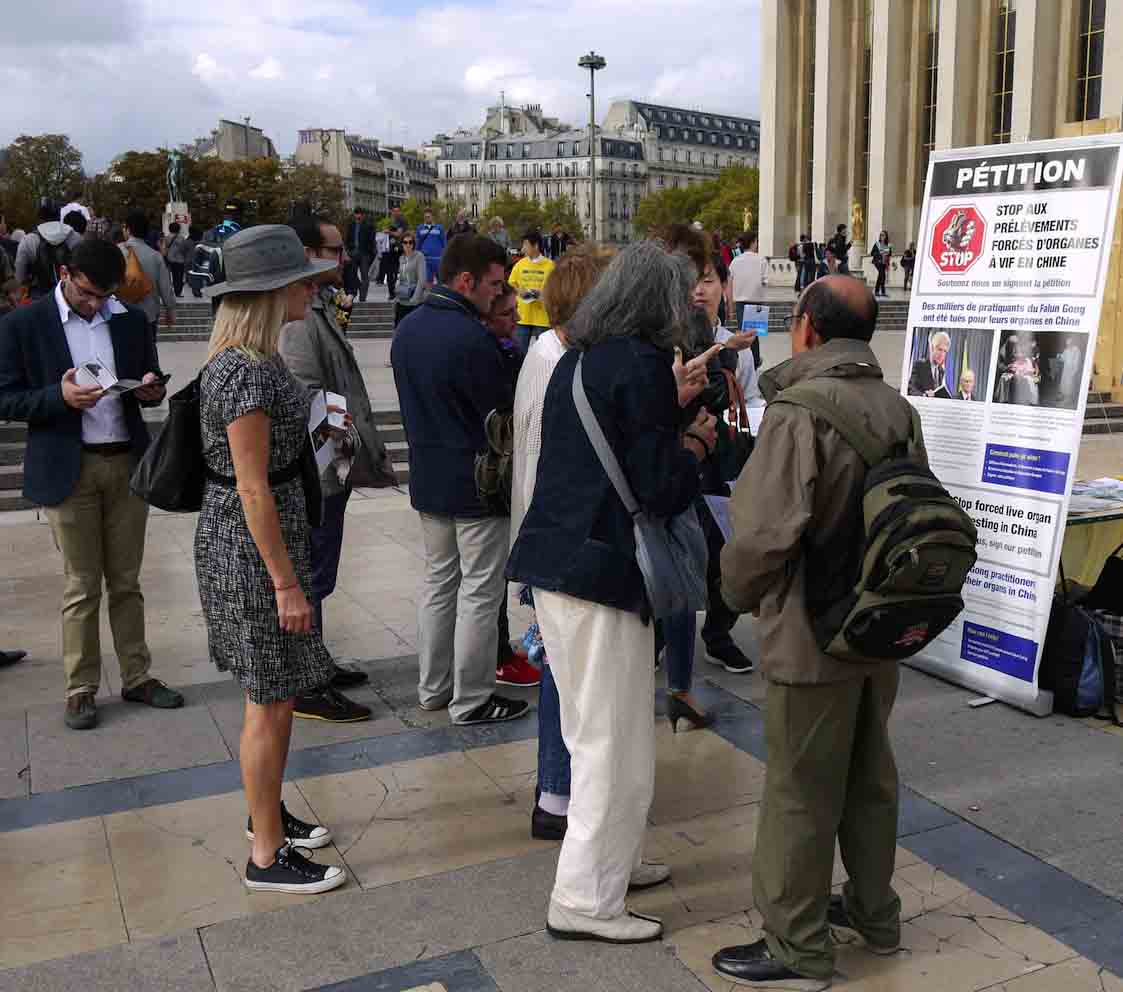 法国著名媒体《巴黎人报》(Le Parisien)一媒体人来到活动地点,他问法轮功学员,有没有证据证明中共活摘法轮功学员器官。法轮功学员告诉他,共产党挖了人的心,它不会拿在手上告诉你是它摘的。一名曾经在中国参与摘取法轮功学员器官的医生的太太在美国揭露了这一骇人听闻的事实,使活体摘取法轮功学员器官的罪恶得以曝光。从那以后,国际上的独立调查团体也开始了调查,《国家器官》这本书的法文版都出版了,在书店里可以买到。中国大陆互联网搜索网站上也登过有关活摘器官的文章。法轮功学员最后还给了他相关资料和网址后,这位媒体人告诉学员他会回去查看,他还索要了法轮功学员的手机号码。