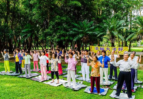![]() 在台南东宁公园中央大草地上,清晨人们总会听到悠扬祥和的炼功音乐,法轮功学员在此集体炼功。 |