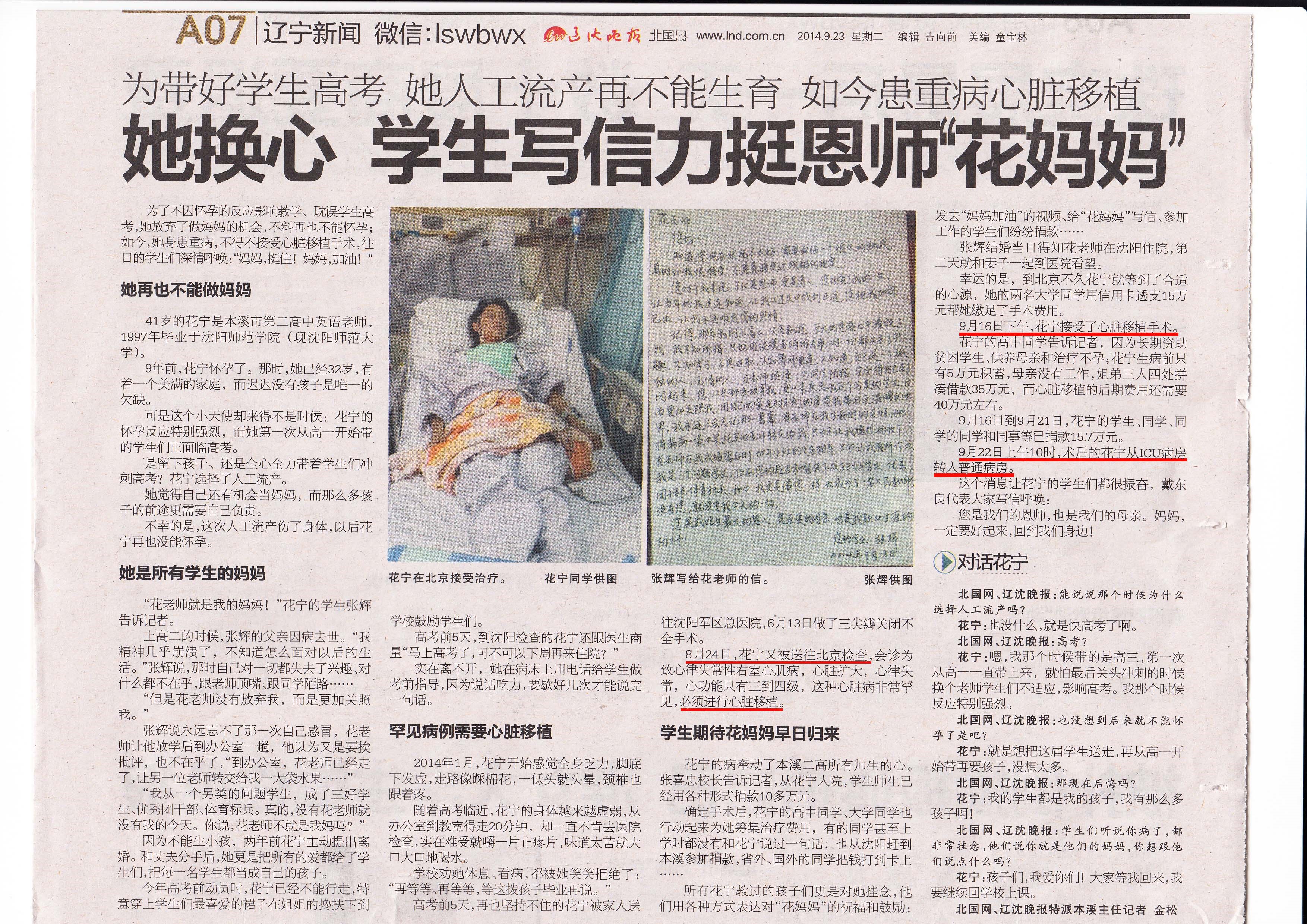 辽宁省本溪市第二高中英语老师花宁,因患心脏病,于八月二十四日到北京某医院就医,九月十六日下午,该医院为其做心脏移植手术,九月二十二日上午十时,术后的花宁从ICU病房转入普通病房。