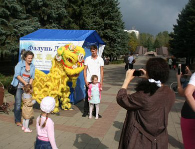 法轮功学员在公园入口处的中央广场铺设了展台,通过叠纸莲花向游园的孩子和大人们讲述法轮功学员的故事。离此不远的公园中央通道两侧,法轮功学员身着黄衣,一侧是腰鼓队表演,另一侧是法轮功功法演示,还有一只舞动的狮子在观众中间穿行,场面祥和美好。