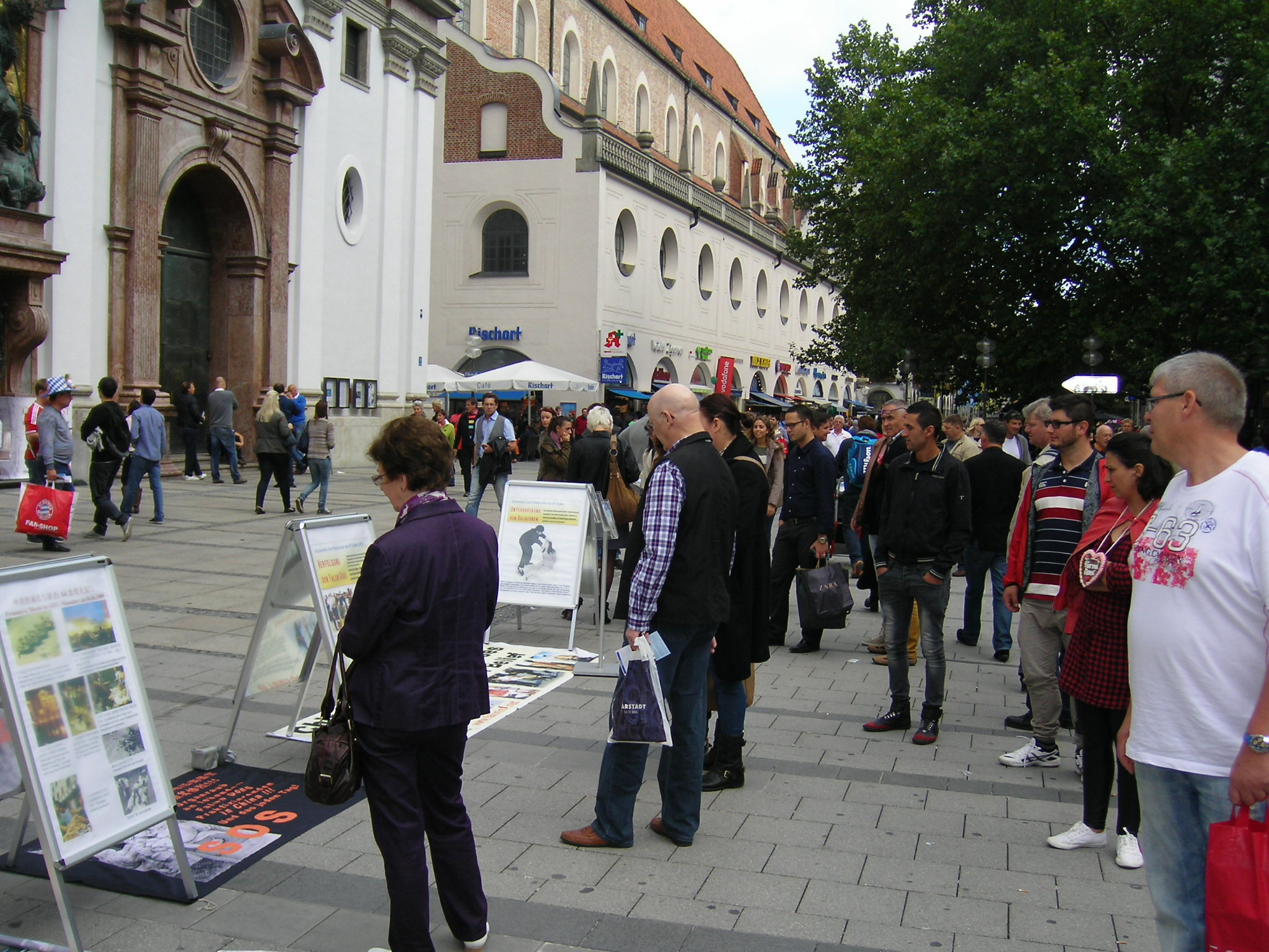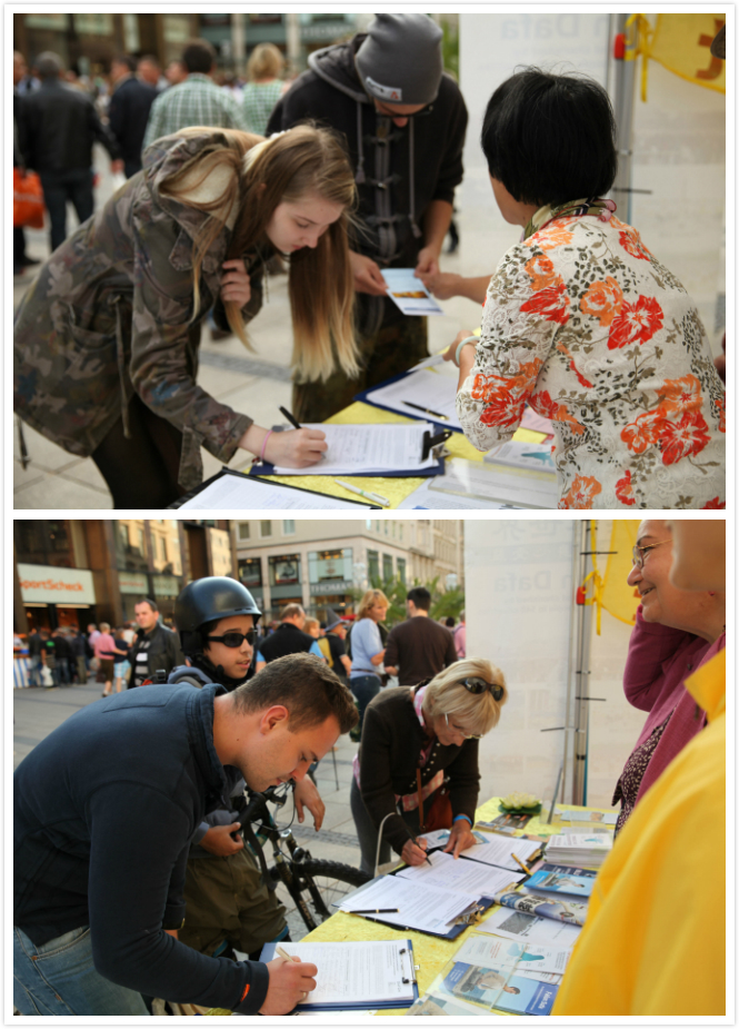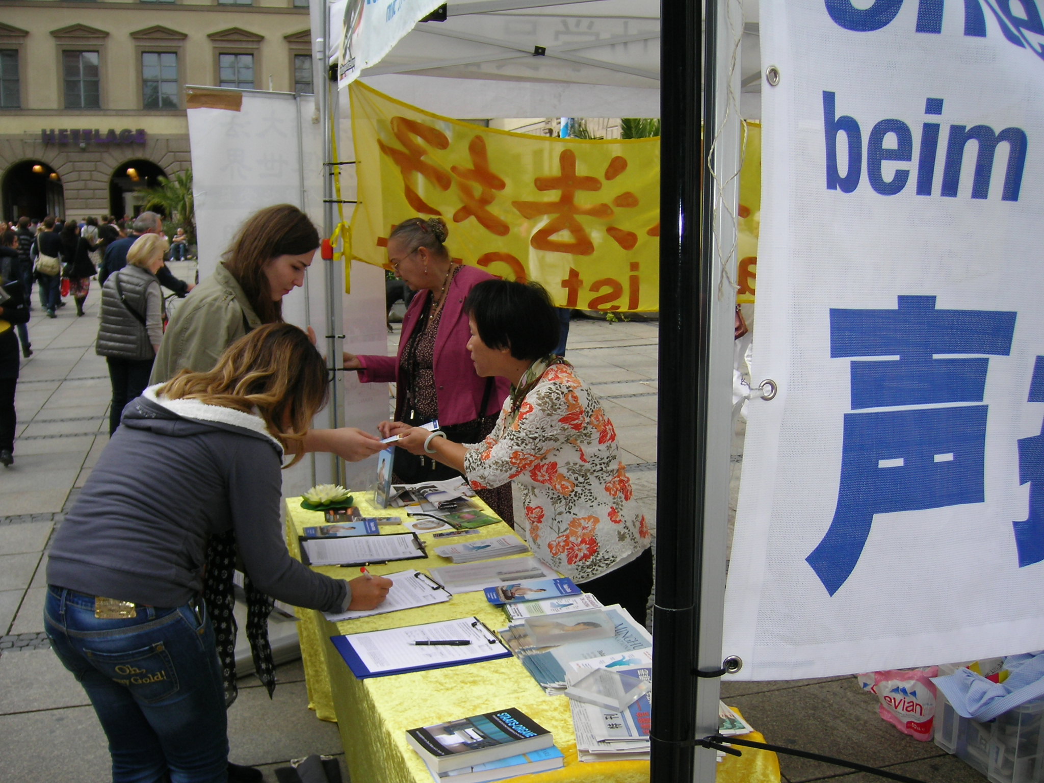 二零一四年九月二十六和二十七日,法轮功学员分别在慕尼黑市中心Tal大街和圣•米歇尔教堂前举办了活动。法轮功学员所展示的图片和横幅震撼了各国民众,他们所展示的功法如此祥和,人们无法把这一切联系在一起,纷纷询问为什么中共要迫害这么平和的修炼人。很多人主动到展台前签名,要求联合国出面调查中共活摘法轮功学员器官的罪行。很多人签完名还不断地对学员道谢,感谢学员做的一切和他们的勇气。