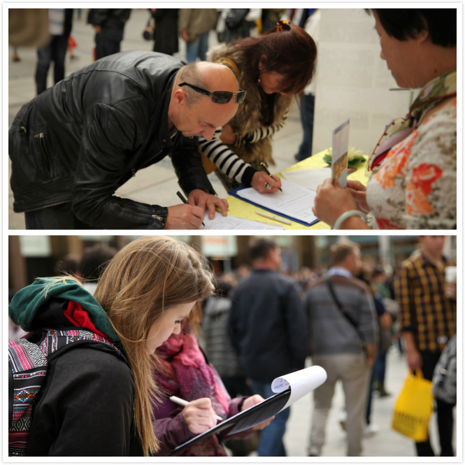 一对德国著名的高级珠宝连锁店老板夫妇恰巧路过圣•米歇尔教堂,看到法轮功学员揭露中共活体摘取法轮功学员器官,他们感到这种事情真是太残忍了,毫不犹豫地签名反对。