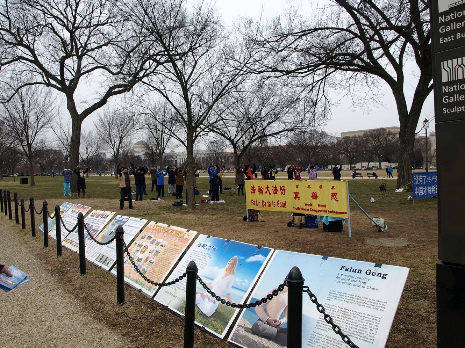 ![]() 华盛顿DC法轮功学员在宇航馆马路的对面设立的真相点 |