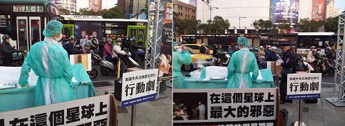 ![]() 图1:“中共活摘法轮功学员器官”模拟演示行动剧吸引游客行人驻足关注。 |