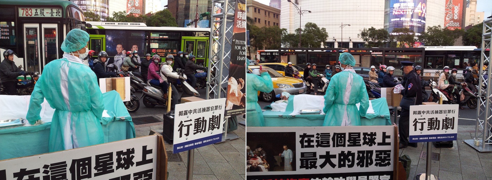 ![]() 图2-3:“中共活摘法轮功学员器官”模拟演示行动剧吸引车上乘客、摩托车骑士以及熙来攘往的民众聚焦注目。 |