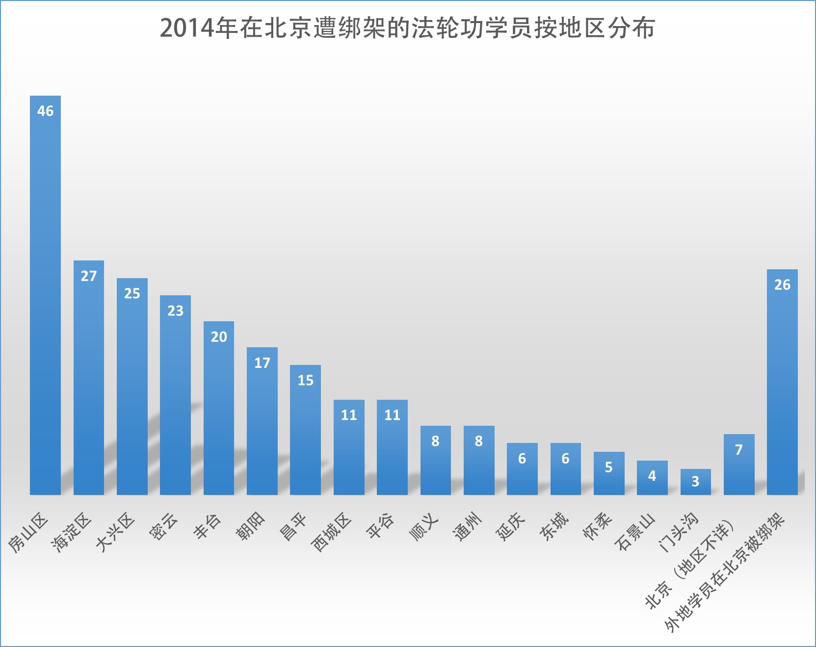 房山区当局在2014年共绑架46名法轮功学员(这还是保守数字),主要集中在两会期间,纠集大批警力到法轮功学员家中去抄家、绑架,有一次绑架几名、十多名的。警察采取蹲坑、盯梢、跟踪、欺骗、断电等卑鄙手段,闯进法轮功学员的家,抄走多套电脑、打印机、打印纸、手机、大法书及其他大法资料,大部分关进洗脑班、看守所迫害,有的人遭2次绑架,被骚扰的有20多人。
