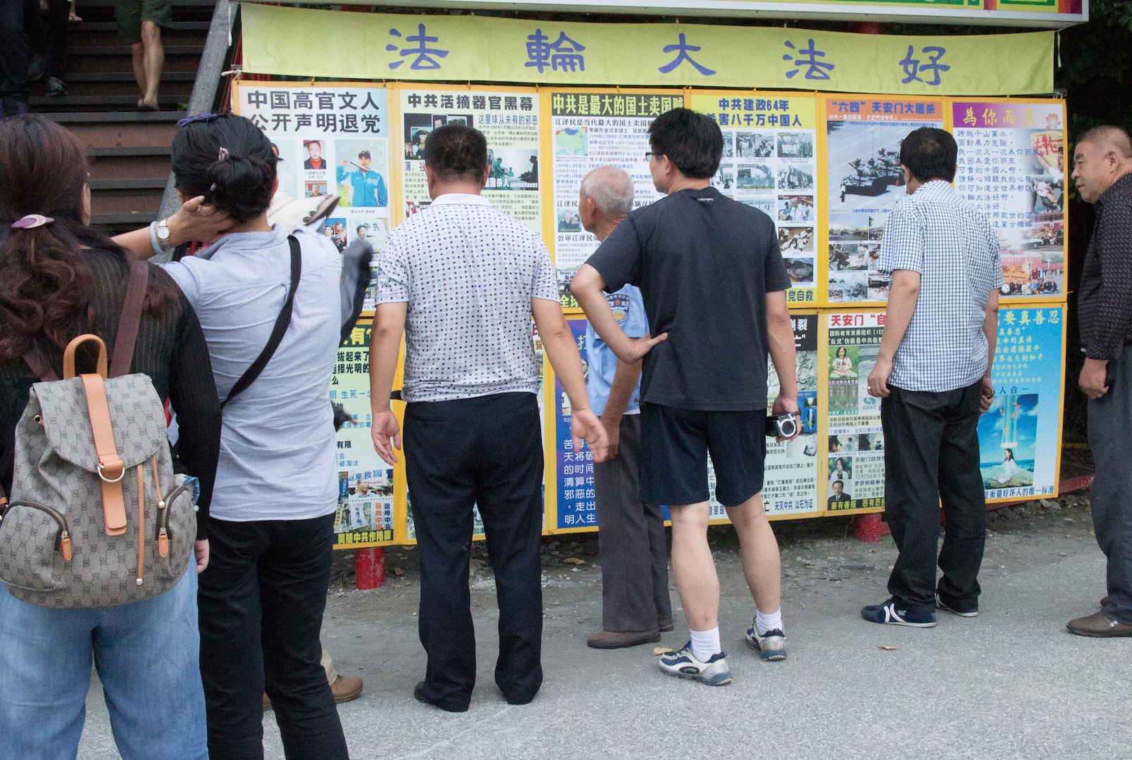 ![]() 在西子湾“法轮大法好”的真相墙很吸引大陆游客驻足观看,一位先生说:“这些都是在大陆看不到的真相。” |