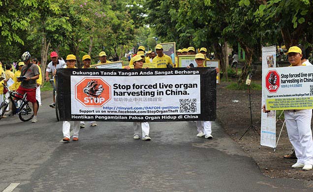 一部分学员手持制止活摘罪行的横幅和展板在大路上行进,另一部分学员分发法轮大法简介和揭露中共活摘罪行的资料,还有一部分学员征集签名谴责活摘器官罪行。