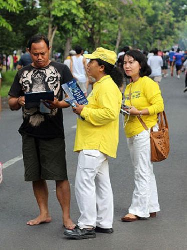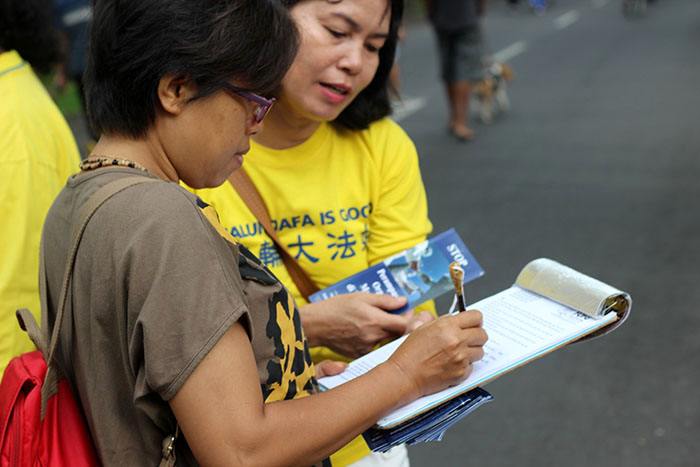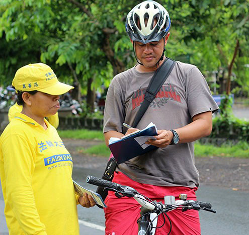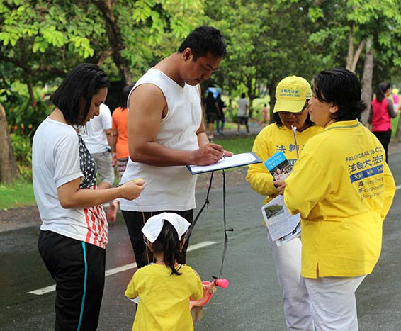 当地很多善良的民众,无论是慢跑、散步还是在骑车,他们纷纷停下来,在征签表上签名,表示对法轮大法的支持,并且希望尽快结束活摘器官这种反人类的罪行。