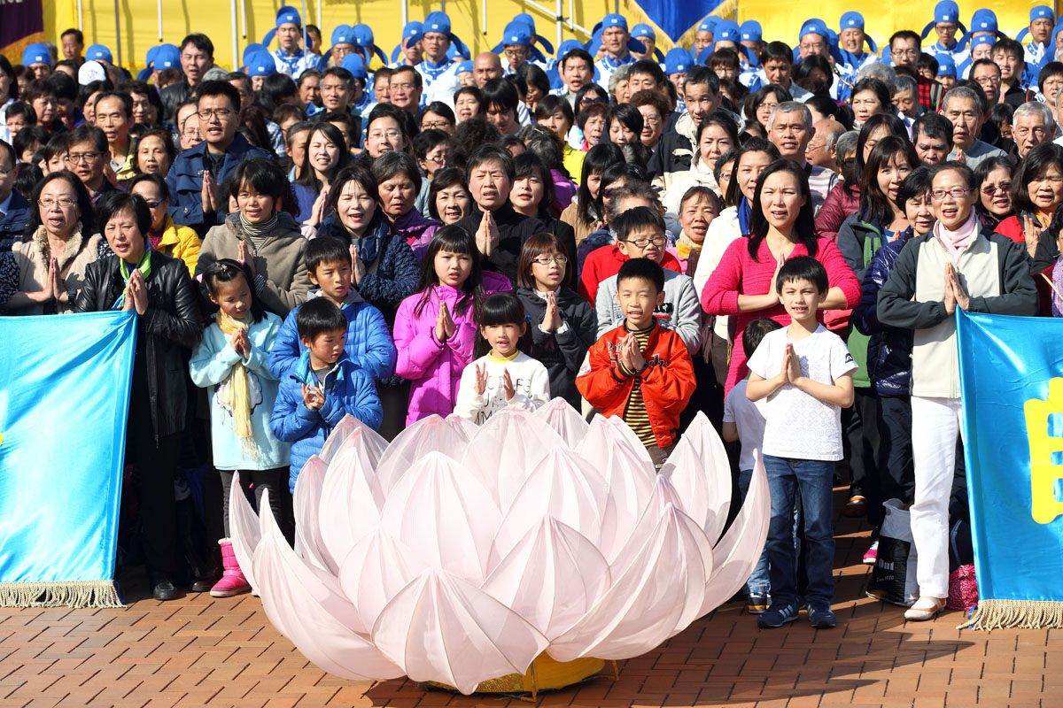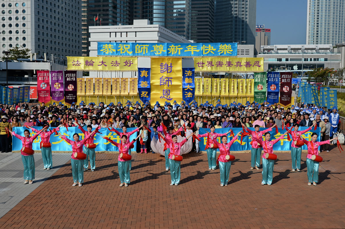 元旦日天朗气清,来自香港及台湾等地的法轮功学员,一早聚集在中环爱丁堡广场附近的香港大会堂外,祝贺慈悲伟大的师尊新年快乐。天国乐团、腰鼓队表演后,学员们恭敬合十,齐声高呼“师父您好!师父新年好!”“恭祝师父新年快乐!”“师父,谢谢您!”,并合唱《唯愿师尊笑》、《谢师恩》、《法轮大法好》、《法正乾坤》等歌曲,在拜谢师恩的同时,向世人传扬法轮大法的美好。现场幡旗横幅色彩缤纷,充满喜气洋洋的气氛。