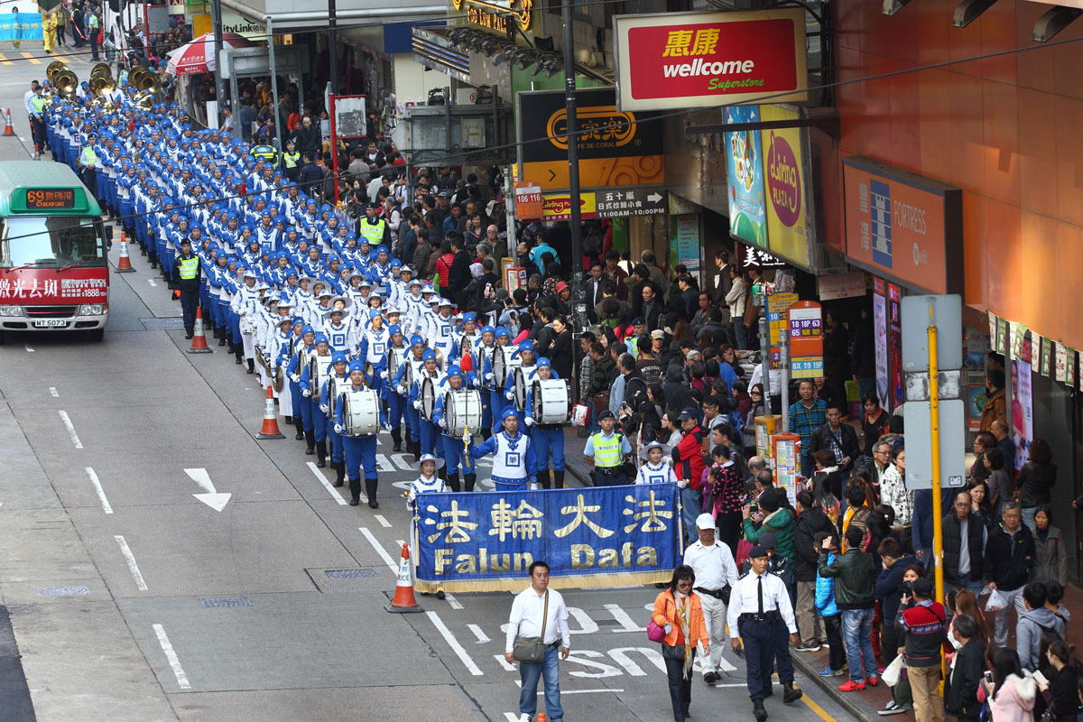 午后,法轮功学员举行新年大游行,向各界民众传扬法轮大法的美好,揭露中共的迫害,呼唤正义良知。法轮功真相在港岛区闹市传扬,感动了成千上万的香港市民及大陆游客,他们纷纷赞叹:法轮功学员修真善忍做好人,真好!