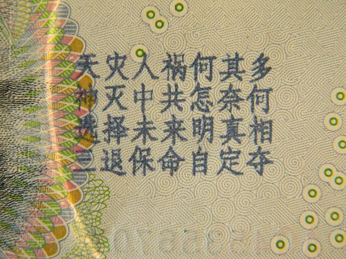 有次我去买菜,见一个菜农拿着一张五元的纸币在端详,我说:“看什么呢,这么用心?”他念了念钱上的真相短语,笑着对我说:“你知道这叫什么钱吗?真相币!”没等我说话,他自己说开了:“就是法轮功用来讲真相的,你看这张是退!党!的,还有写大法好的,《·九·评*》的,还有‘自焚’真相的,活摘器官的,我都收到过。共产党就是坏,造假欺骗,贪污腐败,伤天害理的,什么坏事都干,就是对老百姓不干正事。”我问他三:退.没有,他说:“退了,先写在钱上花出去,后来遇到一个法轮功(学员)给办了声明。”