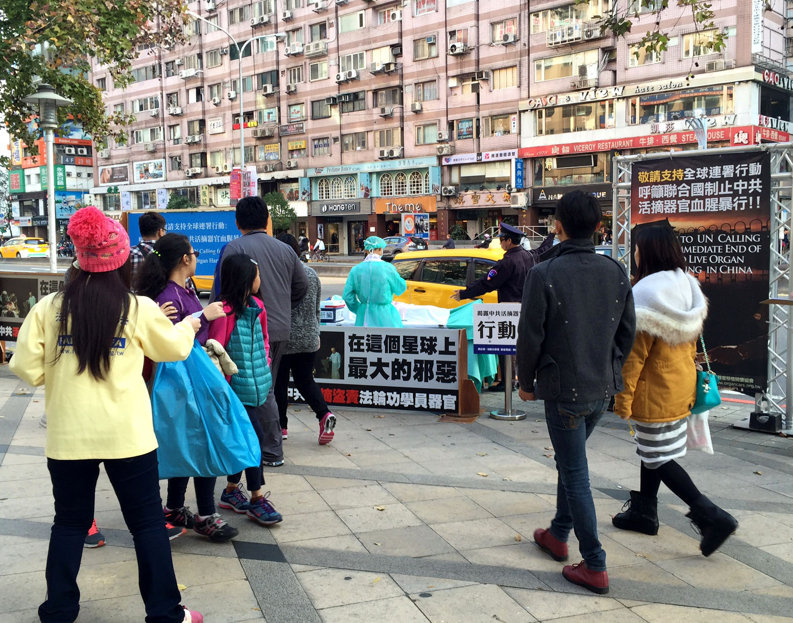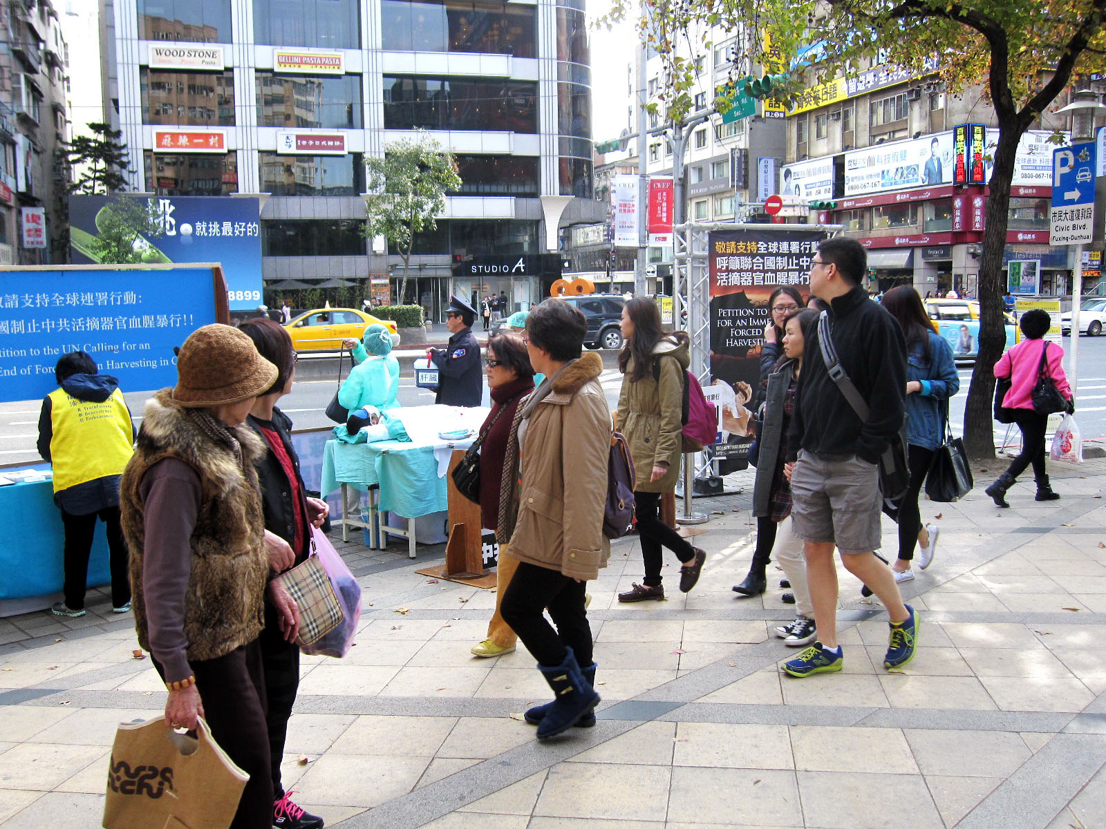 举办以真人演示中共活摘器官的行动剧,许多公车上的民众露出震惊的表情,纷纷拿起相机不断拍摄,而熙来攘往的台北市民,骑单车、慢跑的民众,尽管行路匆匆,也在明白真相后,停下脚步提笔签名,纷纷表达对良心正义的支持。