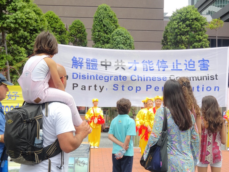 这次活动吸引了许多过往路人,还有一些外国游客驻足观看。他们有的非常认真地仔细阅读展板,有的与派发真相资料的法轮功学员交谈,有的饶有兴趣地观看腰鼓队表演并拍手喝彩,有的拍照录像,还有的华人民众在了解真相后办理了“三:退.”手续。还有一位西人少年了解真相后,帮助法轮功学员派发真相资料。伴随着法轮功轻柔的炼功音乐,整个场面充满着慈悲、祥和的氛围。