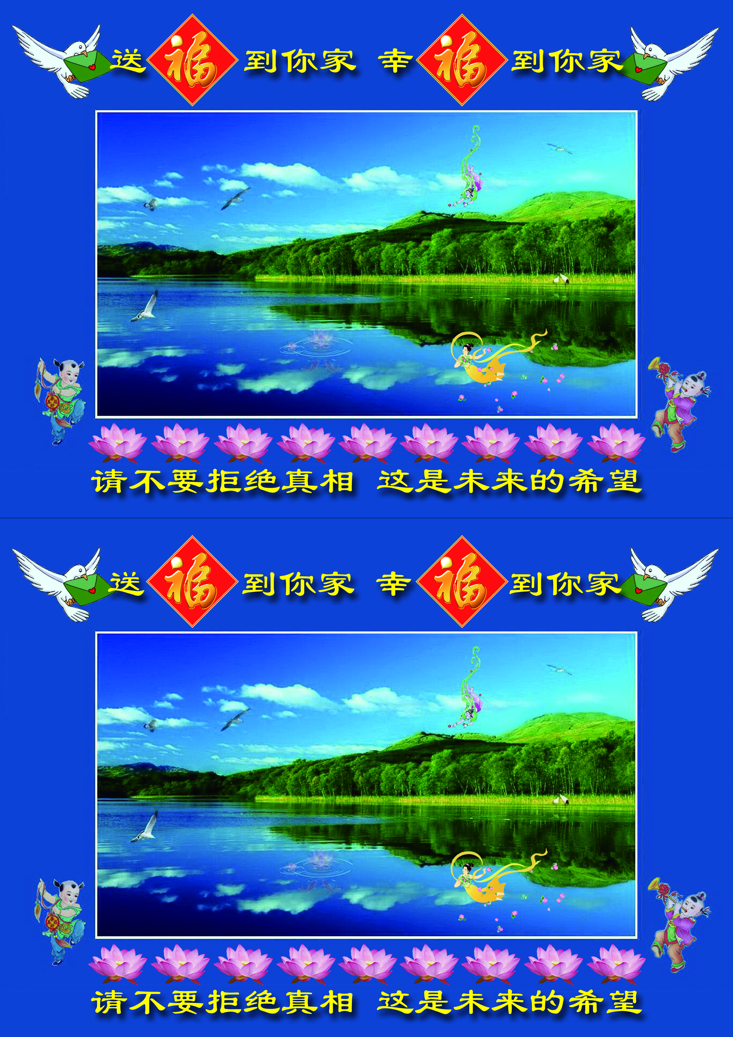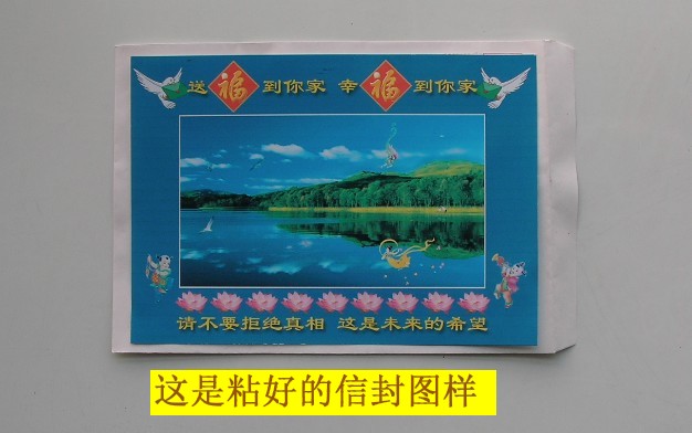 就是设计出一张图片,打印到A4单面相纸上,然后从中间一裁两份,正好贴到能装下2合1小册子的信封上。册子装入后发放时将其别入众生入户门的福字或对联上,或用双面胶粘到门上(双面胶揭下的白纸条一定要收好,不能扔到楼道内,否则会造成人们的不理解)。