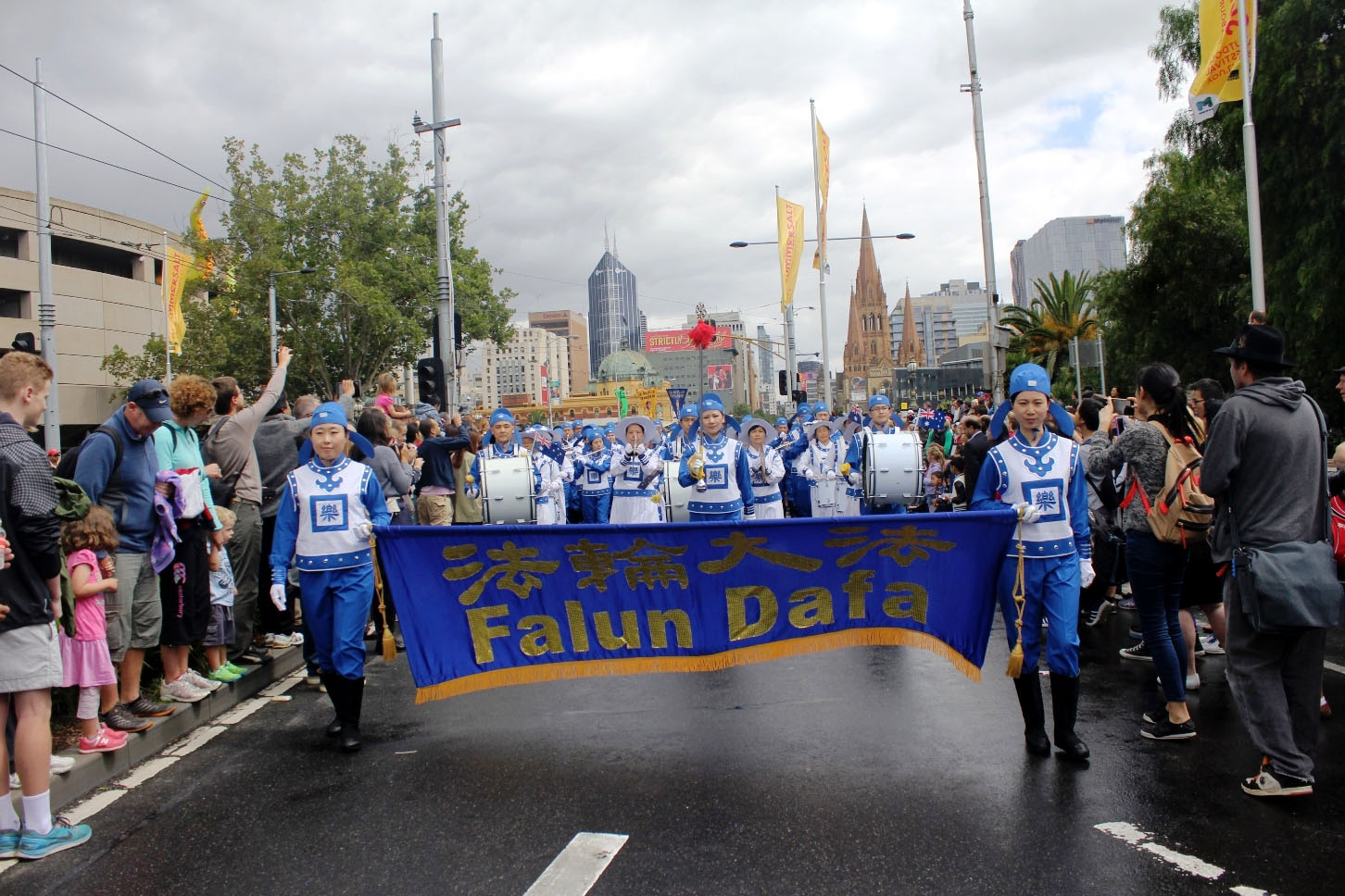 墨尔本法轮大法协会再次受邀参加,壮观的天国乐团队伍一出场,威武雄壮的乐曲,震撼人心,天空突然转晴了。欣赏、赞叹、欢呼也伴随着法轮大法功法展示和扇子舞表演的队伍。