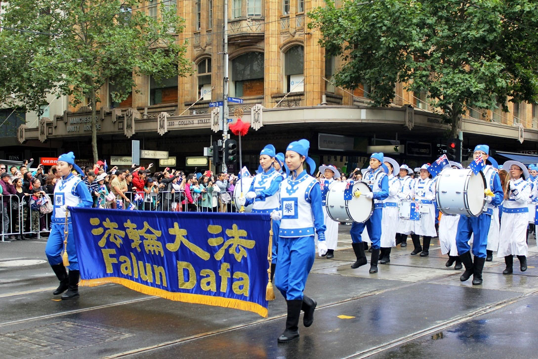 主持人在介绍法轮功队伍时,说道:“欢迎法轮大法的队伍经过市议会大楼。法轮大法是一种古老的修炼打坐功法,她基于普世原则——真善忍,修炼者遍及澳大利亚和全世界100多个国家。法轮大法免费教功,欢迎所有人来尝试这一安静祥和的功法。”