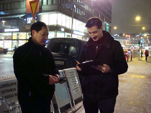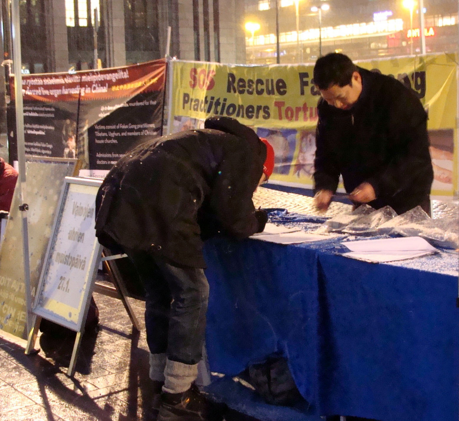 天很黑,大雪纷飞,路上的行人都加快赶路的脚步。在火车站附近的步行道边,随着悲壮肃穆的音乐,法轮功学员们静静地手捧死难同修的遗像一排坐开,这肃穆的场景,使得很多芬兰民众冒雪驻足观看,前来了解真相及签名支持反迫害。