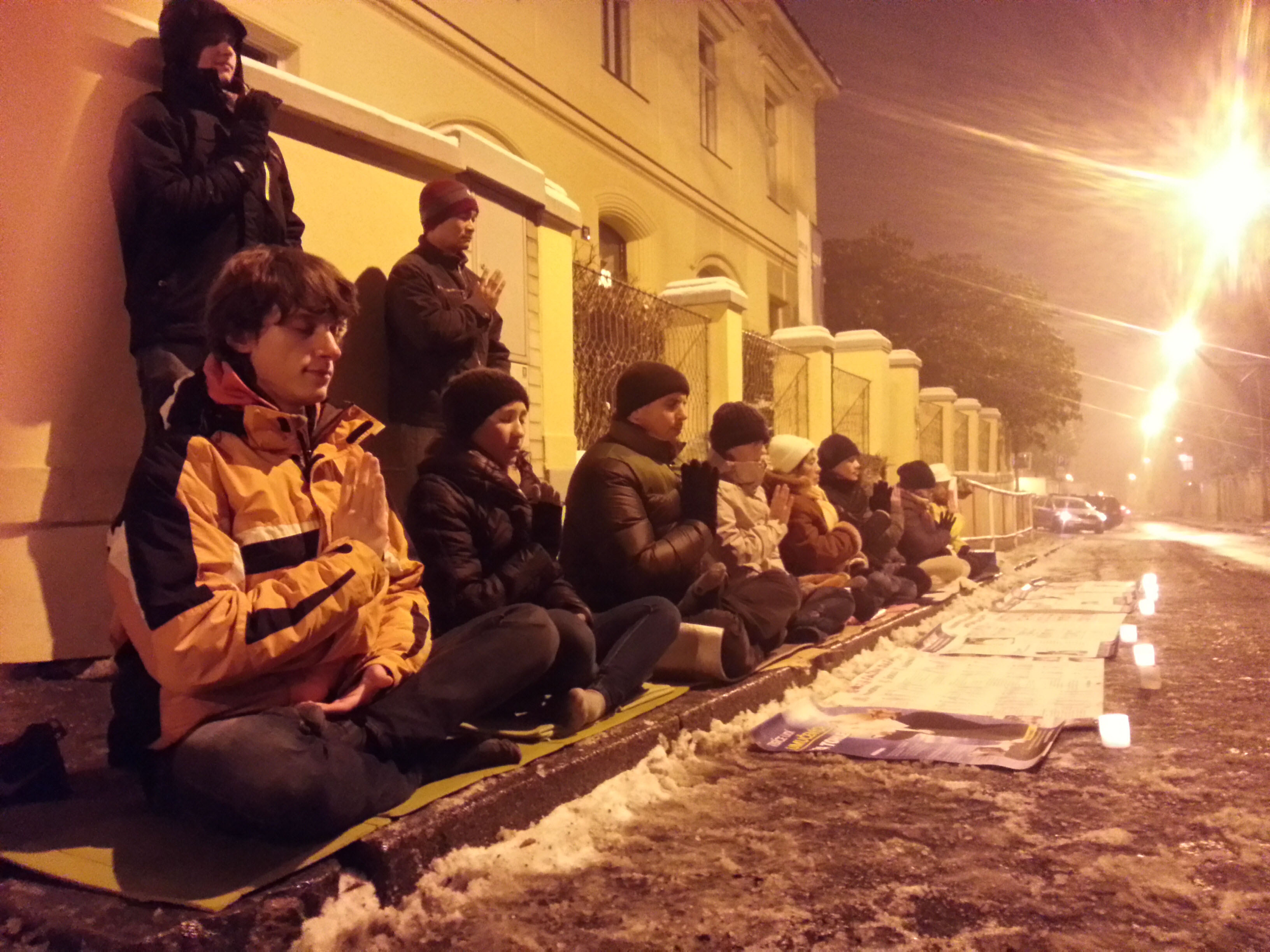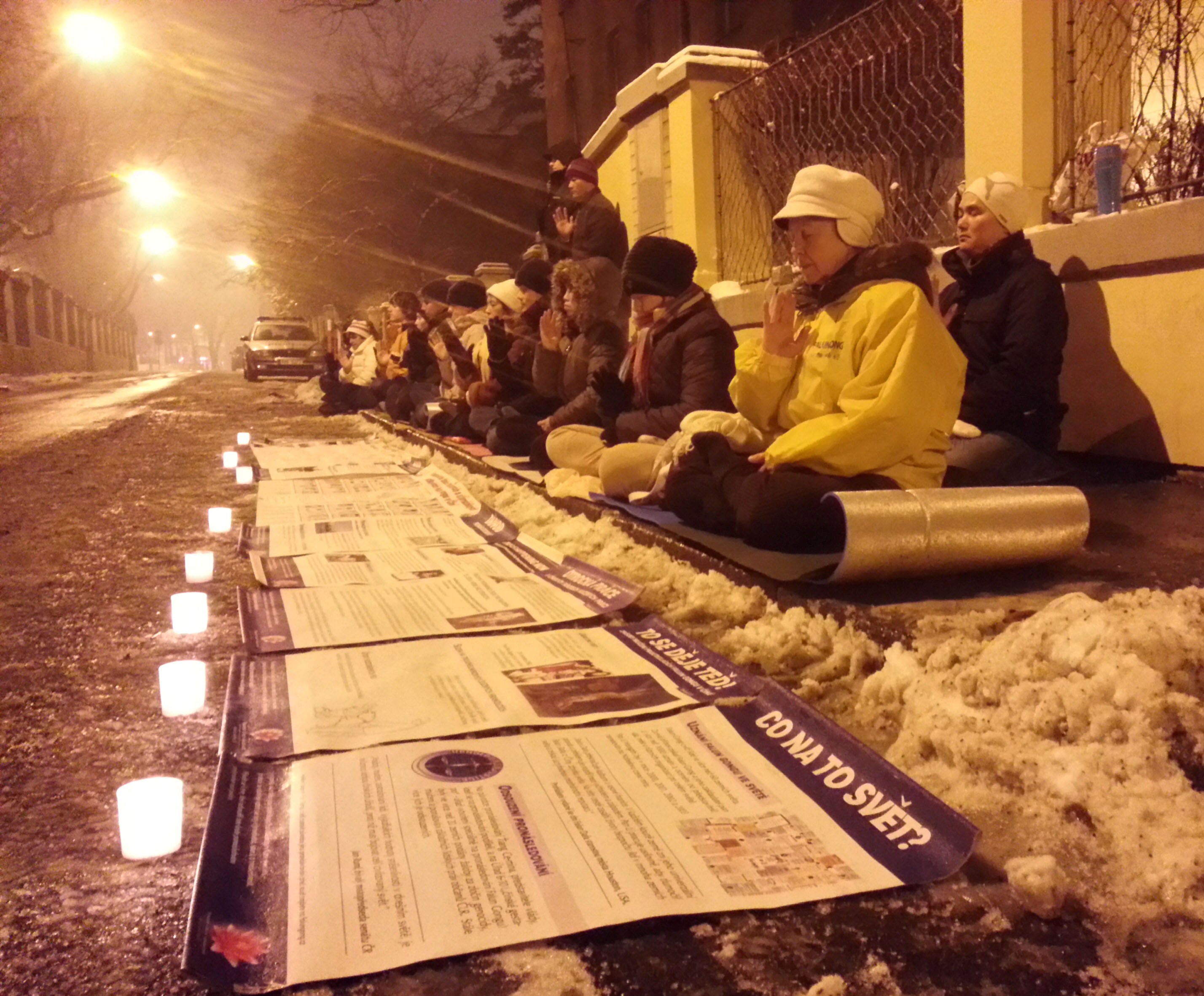 二零一四年十二月三十一日,当夜幕降临时,捷克法轮功学员们来到布拉格市的中共使馆前打坐炼功,要求立即停止迫害。他们安静地端坐,蜡烛一个个被点亮,烛光映照下打坐的法轮功学员多数是西方人的面孔。在冰雪寒冷的深夜中,他们的心飞到了中国。在遥远的中国,法轮功学员因一起炼功和拥有法轮功的书籍就会被绑架,在捷克这里却是自由的。这些捷克法轮功学员希望通过这种和平的方式表达他们对在中国大陆被迫害的同修的支持和敬意。从一九九九年至今的十五年的迫害中,中国大陆的法轮功学员遭到残酷的迫害,他们被毒打和酷刑折磨,被劫持到劳教所和监狱,还有的甚至被活体摘取器官。