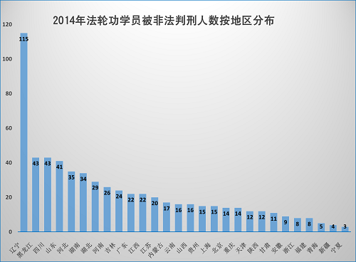 判刑最严重的省份是辽宁省,一共一百一十五人,判刑最严重的城市是辽宁省大连市,共有四十一名法轮功学员被非法判刑。