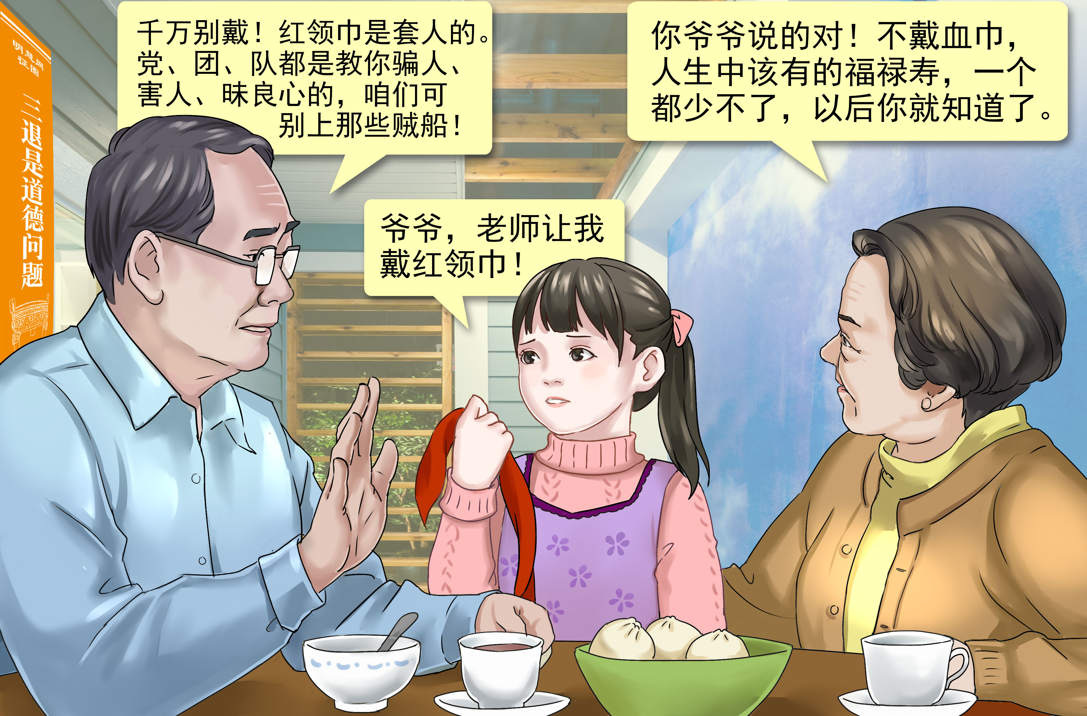 【明慧网二零一五年一月九日】城市一角,祖孙三人围桌相聚。孙女告诉爷爷说:“爷爷,老师让我戴红领巾!”爷爷回答:“千万别戴!红领巾是套人的。党、团、队都是教你骗人、害人、昧良心的,咱们可别上那些贼船!”奶奶说:“你爷爷说的对!不戴血巾,人生中该有的福禄寿,一个都少不了,以后你就知道了。”