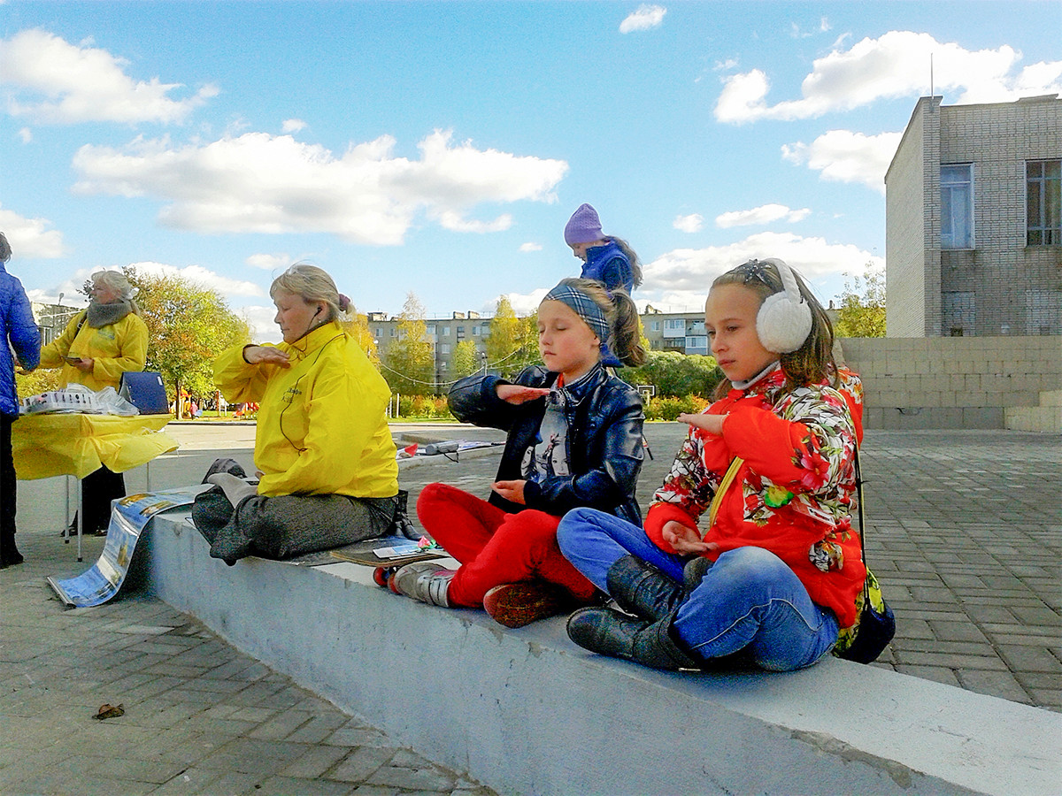 很多居住在这个区并前来文化宫的孩子们对图片和展板上的内容产生了极大兴趣。为什么会发生这样的事?法轮功是什么?如何理解“真、善、忍”?这些上中小学的孩子们的问题没有尽头。他们不仅认真倾听,随后还把别的孩子领过来给他们介绍。很多孩子渴望学习功法,他们十分愿意遵循“真、善、忍”的教导。