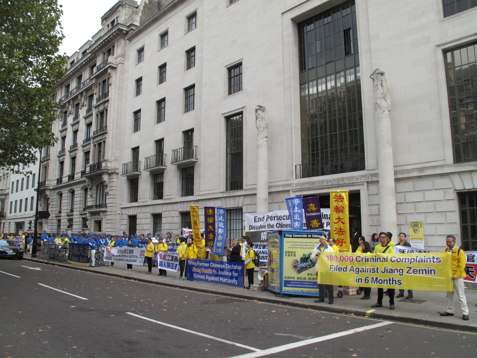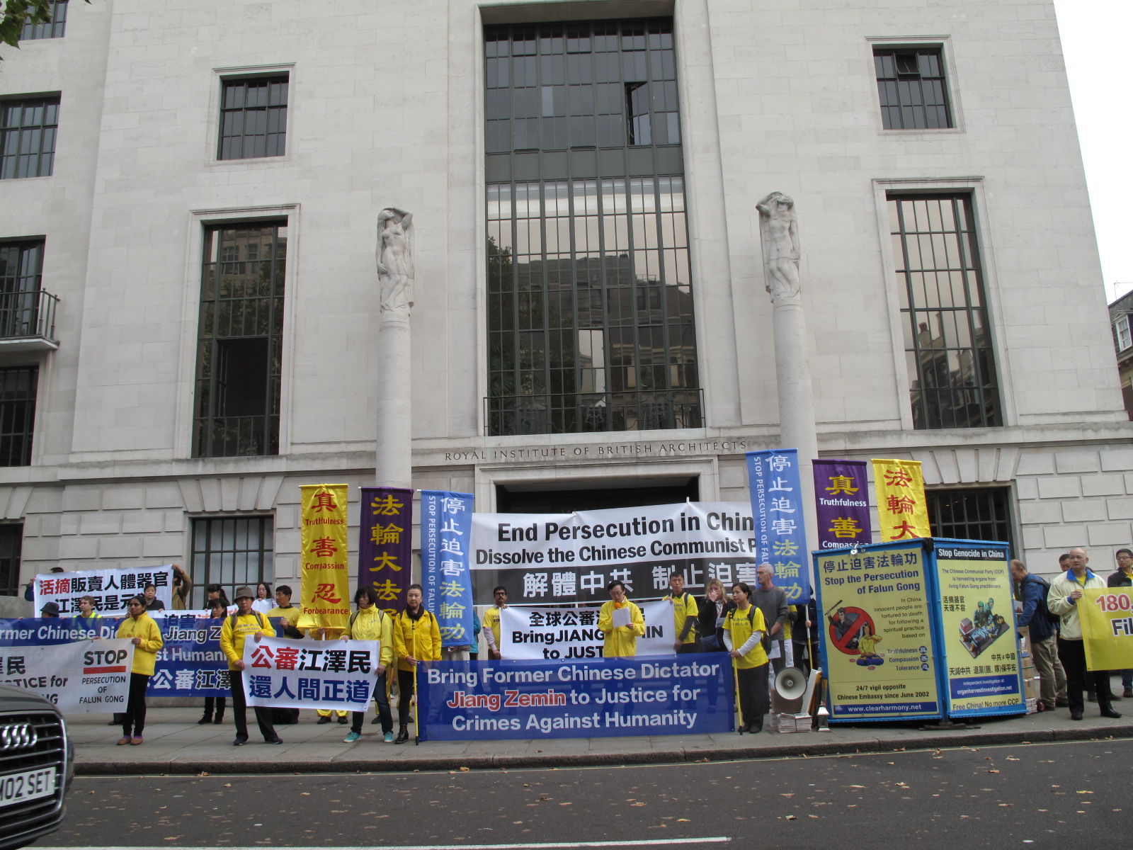 在英国伦敦,法轮功学员们自二零零二年六月五日开始,在中使馆前举行二十四小时和平抗议,至今,和平抗议已坚持近十三年半了。十三年来,法轮功学员坚守在这里告诉人们法轮功真相、正告中共必须停止迫害。同时,法轮功学员也一直在对使馆工作人员发出了解真相选择正义的呼唤。法轮功学员真相台顶部覆盖着一块真相展板,上面写着法轮功师父在《洪吟三》中的一首歌词〈找真相〉:“贫富都一样 大难无处藏 网开有一面 快快找真相”。这个展板从中使馆二楼以上的窗户就能够看到。
