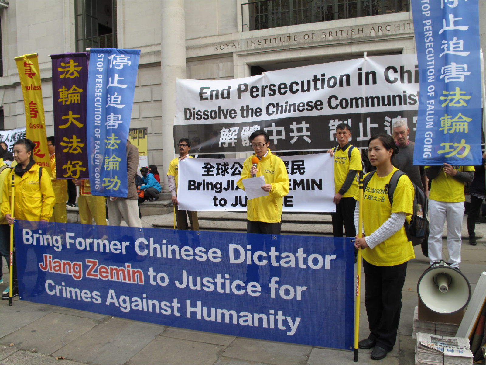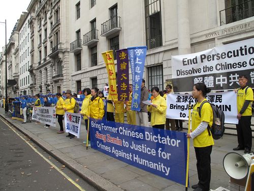 上午十一点二十分新闻发布会开始。英国法轮大法学会主席刘博士、欧洲法轮功之友副主席约翰·迪、曾在中国大陆遭受迫害并已在今年六月向中国高等法院和检察院控告江泽民的法轮功学员宋女士,以及英国法轮功学员尼尔先后在集会上发言。四位发言人希望他们讲真相、呼吁制止迫害的声音,特别是声援诉江大潮的最新信息让中共大使馆的工作人员听到、让即将在十月二十日来访英国的现任国家领导人习*近*平听到、让更多的广大民众知道,从而推动整个社会正确认识法轮功,共同制止迫害。