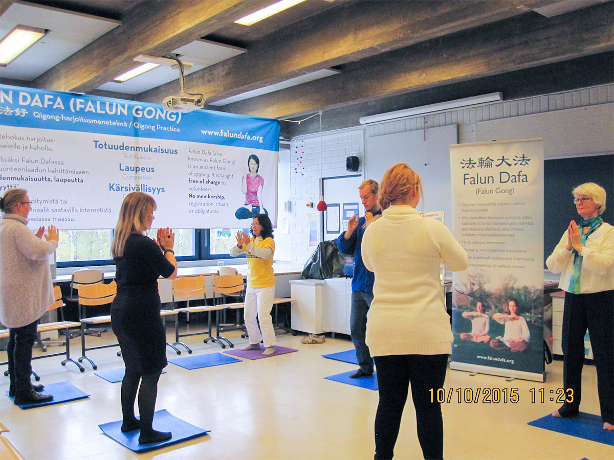10月10日、11日两天在芬兰举办的健康博览会的弘法活动期间,一批批气功爱好者在经过展位前,纷纷被大法的音乐所吸引并走入学功的行列。期间,记者递给一位匆匆而过的中年女士的一份大法简介时,并告诉对方现在刚开始免费教功第一套功法,不妨试试?对方表示,她很感兴趣,但是只有15分钟的停留时间,可以学到吗?记者说:只要你愿意,当然可以。