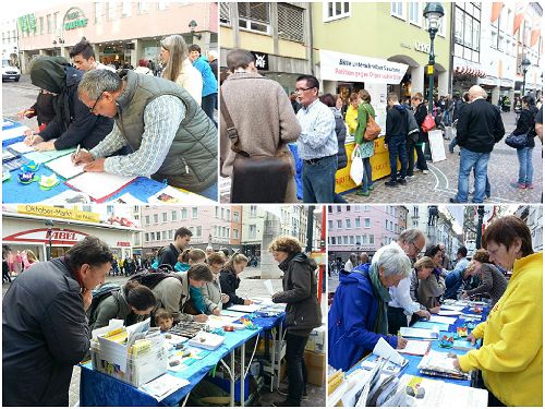 一位德国老先生,在征签台前站了许久。他说,我经历过二战纳粹迫害犹太人。现在共产党迫害法轮功,比那时候还厉害。活摘器官贩卖?!纳粹都没干出来。他拿了不少真相资料,签了名,非常真诚地对法轮功学员说:“做下去,都支持你们,会成功的!”