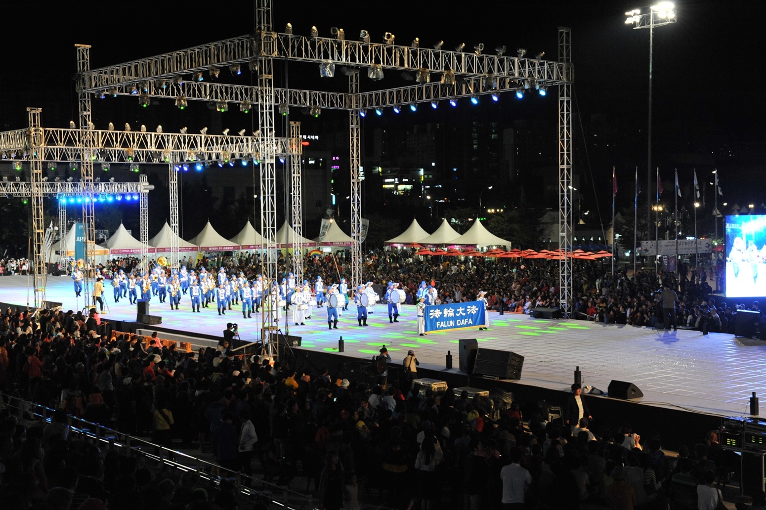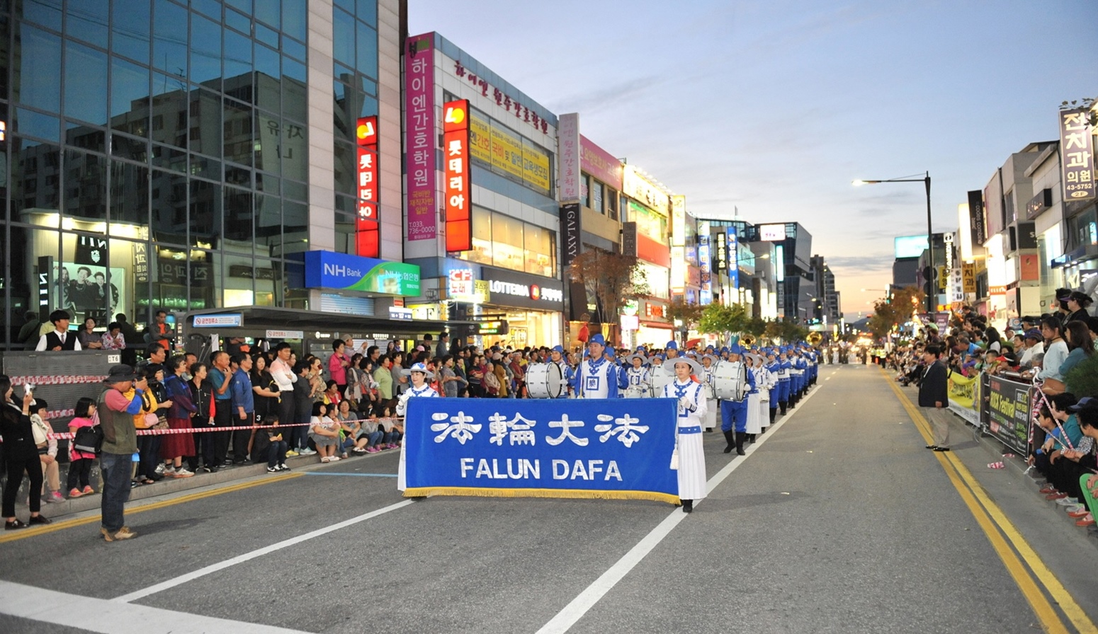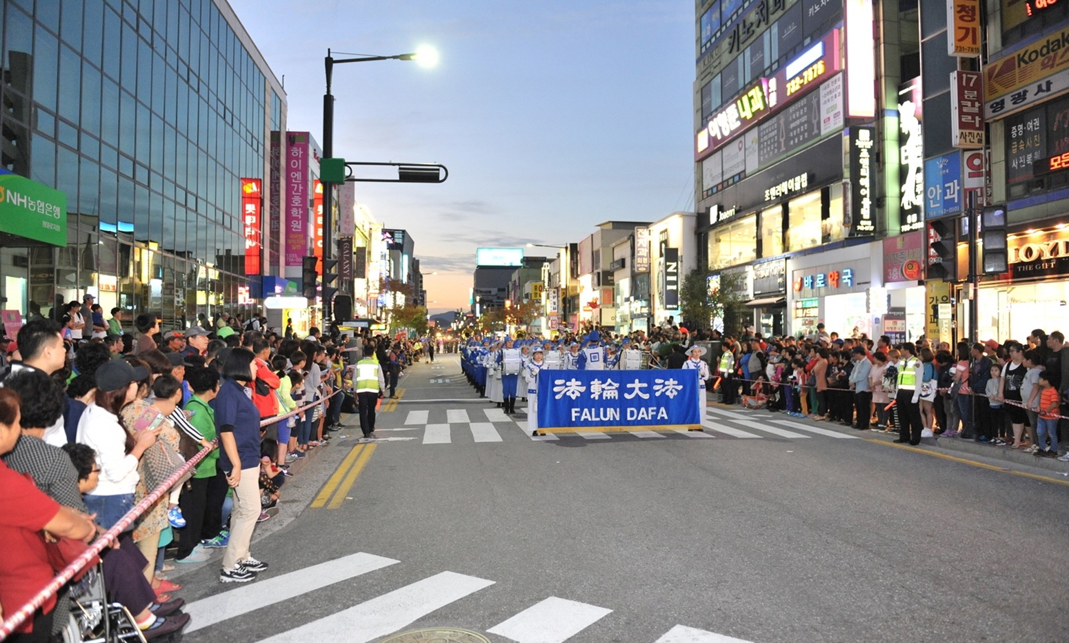 此后,天国乐团又在可容纳四千名观众的原州 Tattoo 演出剧场的长达一百二十米的大型特设舞台,展开了演奏和游行表演。当天国乐团出现在特设舞台时,观众们报以热烈掌声喝彩,天国乐团演奏 《法轮大法好》、《法鼓法号震十方》、《送宝》等乐曲。身穿古典唐装的天国乐团,服装醒目威武、队列整齐、步履铿锵,观众们掌声喝彩如雷,直到天国乐团从特设舞台走出演出剧场。
