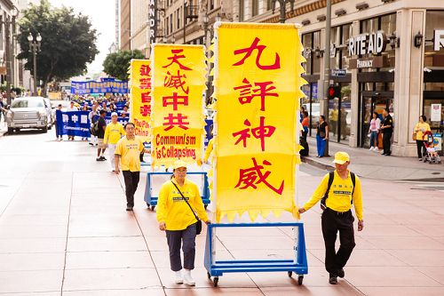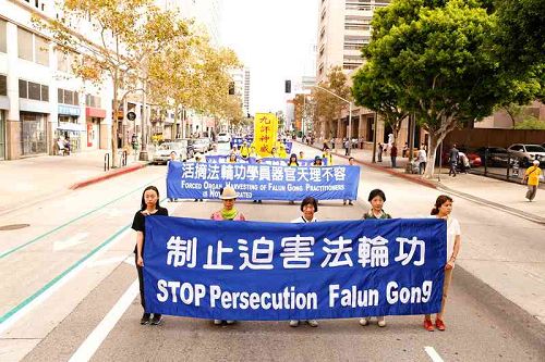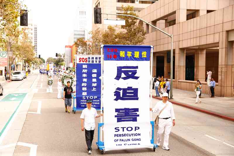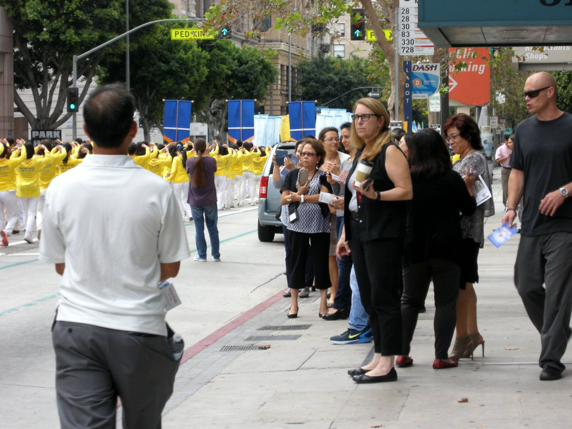 在洛杉矶航空公司工作的Elline ,刚好到附件的公司办事,遇见了游行,她在观看游行中说:“这是一个非常好的游行。现在这个世界不是很多人愿意去帮别人的,而这又是我们所需要的,我们需要爱,需要互相帮助,需要和平。很多人不明白,所以有人被杀,有人被迫害,而每天都还在发生着。今天这个游行就是让人们更清楚在中国发生的虐杀事件。自由是所有人的权利,如果我今天不是要上班,我一定会参加到这个游行中去。”