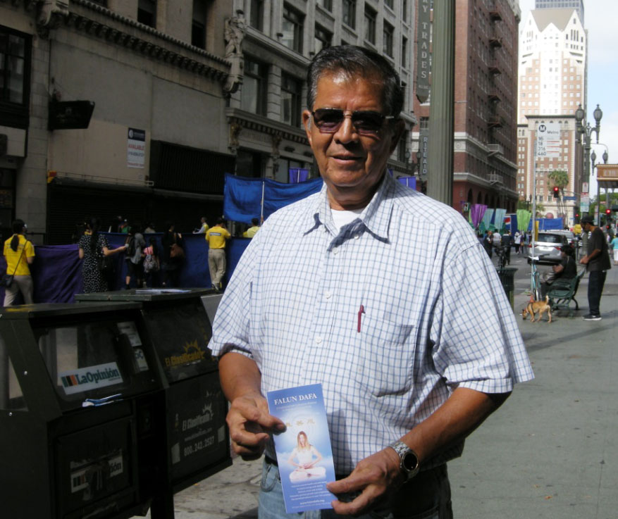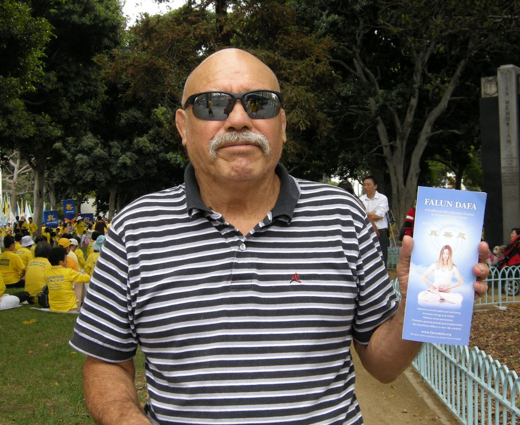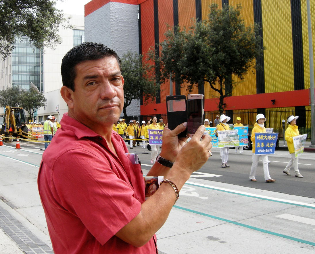 在洛杉矶生活了四十多年,做手表修理工作的Artuio在游行队伍出发前接到了法轮功学员递上的传单,他说:“我看到游行出发前集体炼功的场面,我非常感兴趣,我觉得我要学这个功法。这个活动太好了,让更多的人知道这么好的功法。我看到他们是那么的平静,那么的美好,我还看到有很多不同民族、不同肤色的人都在炼这个功法。我非常感兴趣,也非常感谢。”