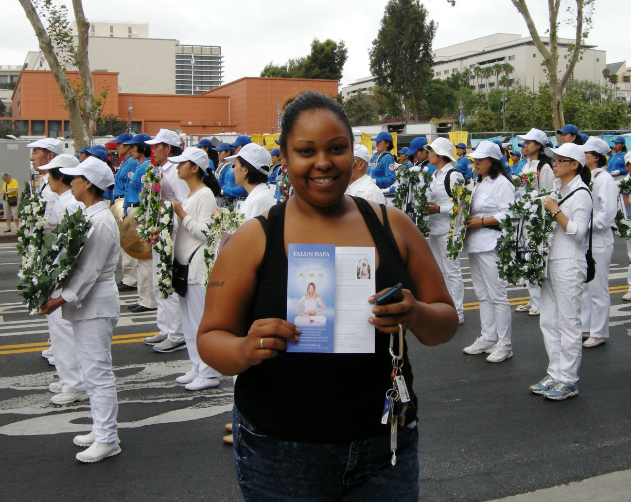 女演员Liz Huston在公司的摄影棚听到天国乐团的音乐,就跑下楼来观看游行,她被音乐和游行的阵势所吸引,一直跟着游行队伍到终点。她拿着法轮功学员给她的传单兴奋地说:“我今天得到了一份非常好的礼物。”