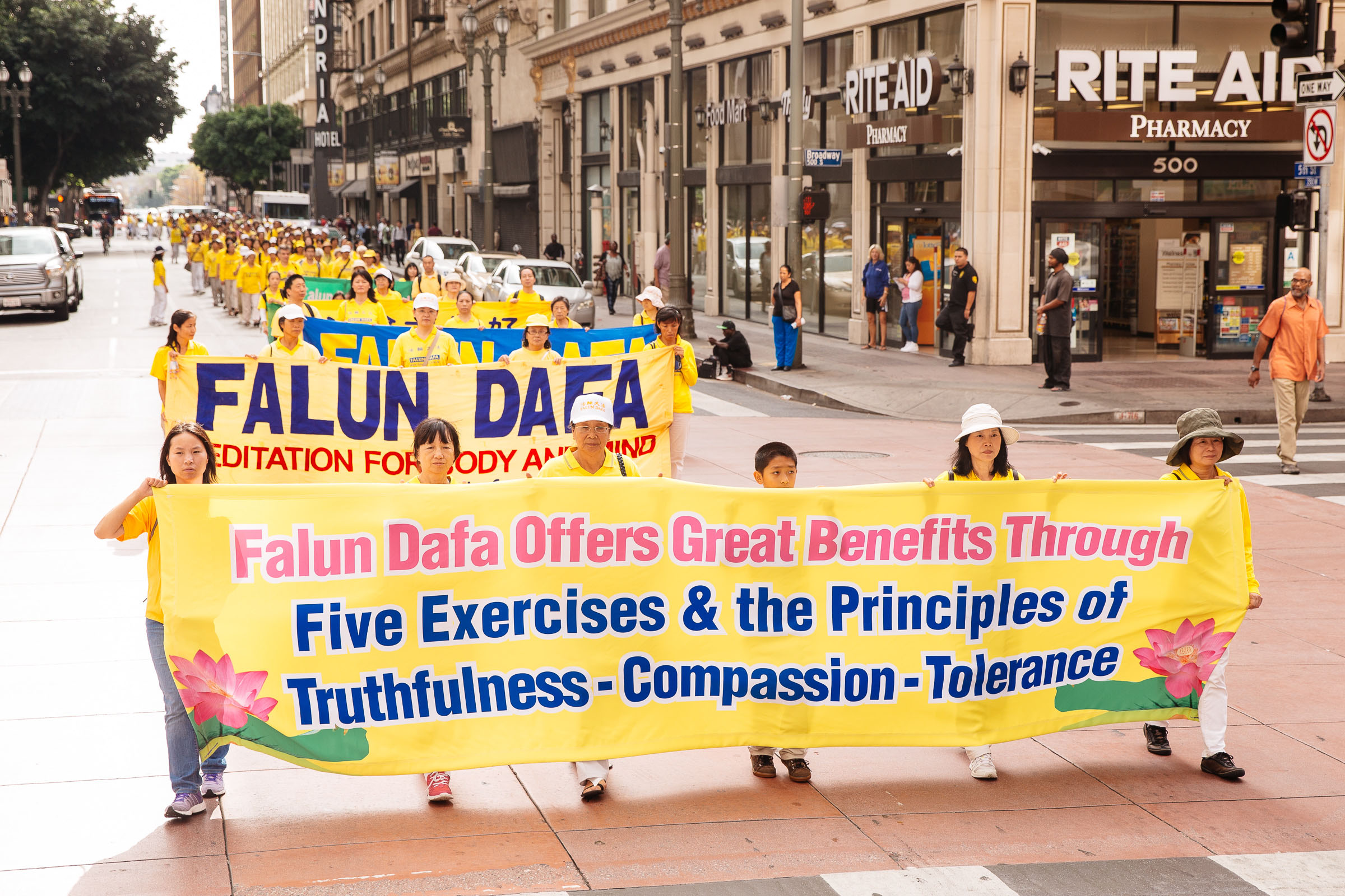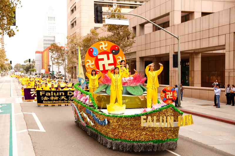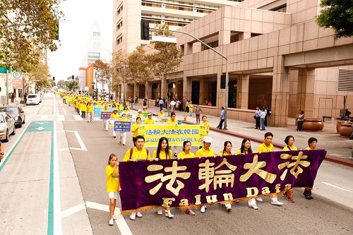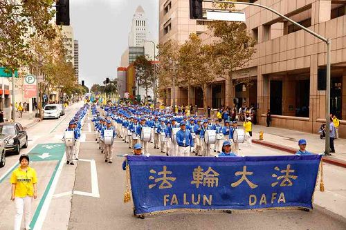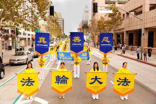 二零一五年十月十五日十点开始,由上千名来自世界各地的法轮功学员组成的游行队伍,从洛杉矶市政厅大楼(Los Angeles City Hall)出发,沿春街(Spring St)一路行经1至5街,最后到达集会地点潘兴广场(Pershing Square)。