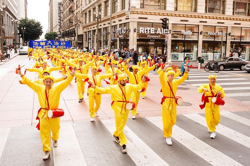 大游行由天国乐团领先出发,接着的方阵有:旗队、炼功队、花车、法轮大法弘传横幅队、悼念队、青少年“骑向自由”之旅团队、腰鼓队、诉江、反活摘器官以及退!党!解体中共。九大方阵组成的游行队伍浩浩荡荡,场面盛大壮观,吸引了路人停驻观看。