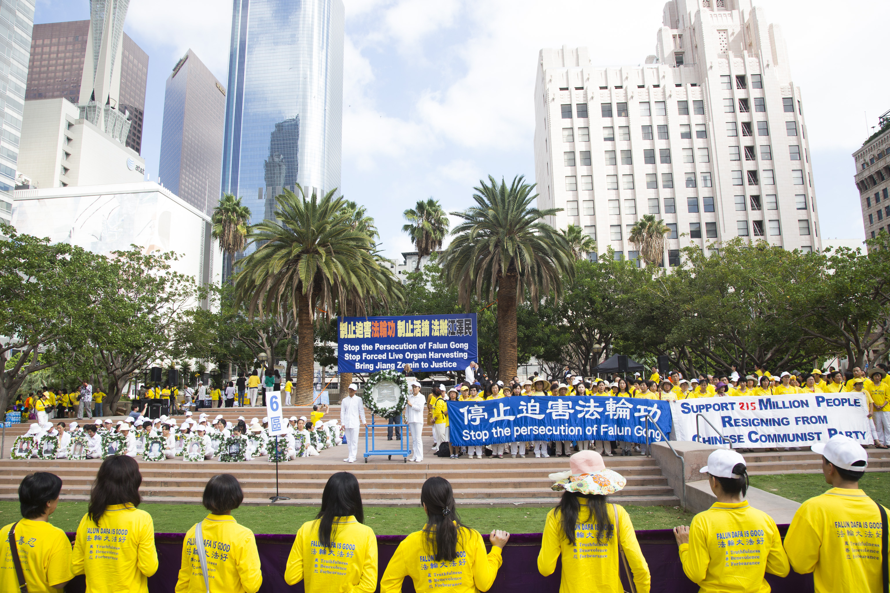 ![]() 图1:十月十五日上午,法轮功学员在洛杉矶市中心潘兴广场(Pershing Square)举行大型集会,呼吁制止迫害、法办迫害元凶江泽民。 |