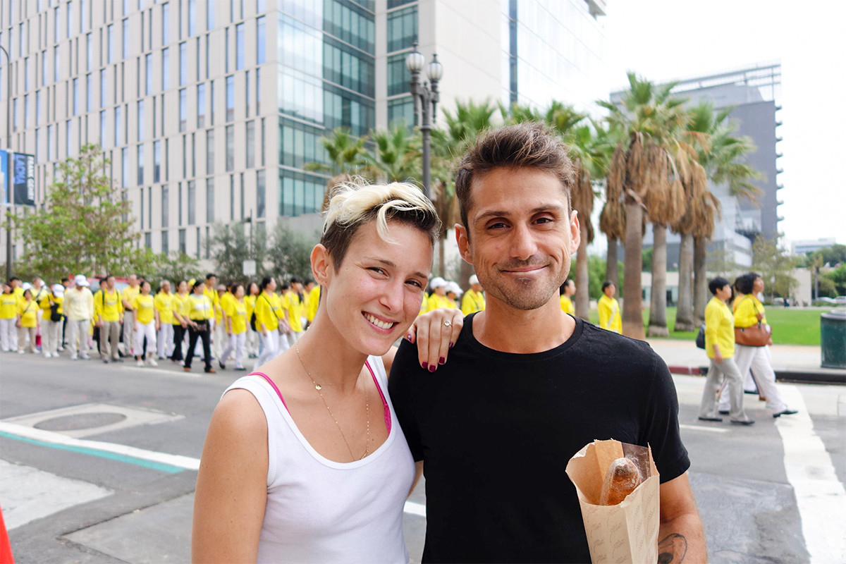 来自意大利威尼斯的一对年轻情侣,小伙子以前曾经得到过一张介绍法轮功的传单,他向女朋友介绍说法轮功的卍字符是个很古老、很和平的标志,法轮功很好,不断向社会传播良善的信息。
