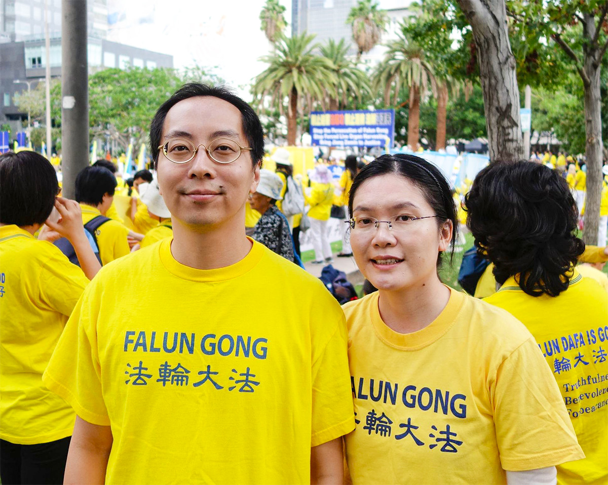 来自台湾的吴先生是台湾大学大气科学研究所的博士,目前在一家媒体公司的资讯部门工作,他跟随同为大学教授的双亲修炼法轮功已经十七年。学炼法轮功后,他明白了人来世上的目的,开阔了自己的视野,了解了人在地球上、在宇宙中的定位是什么,更清楚自己应该如何有效地运用这一生。他表示,跟许多修炼法轮功的学员一样,他会很有信心、很踏实,知道自己在做什么,活着是为了干什么。加州大学洛杉矶分校(UCLA)毕业的吴太太则表示,参加法轮功游行等活动,是希望能将法轮大法弘传世界,及中国大陆无辜的法轮功学员被活摘器官的事实,让更多世人知道。