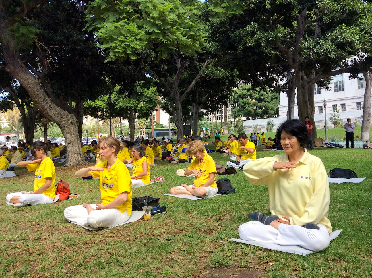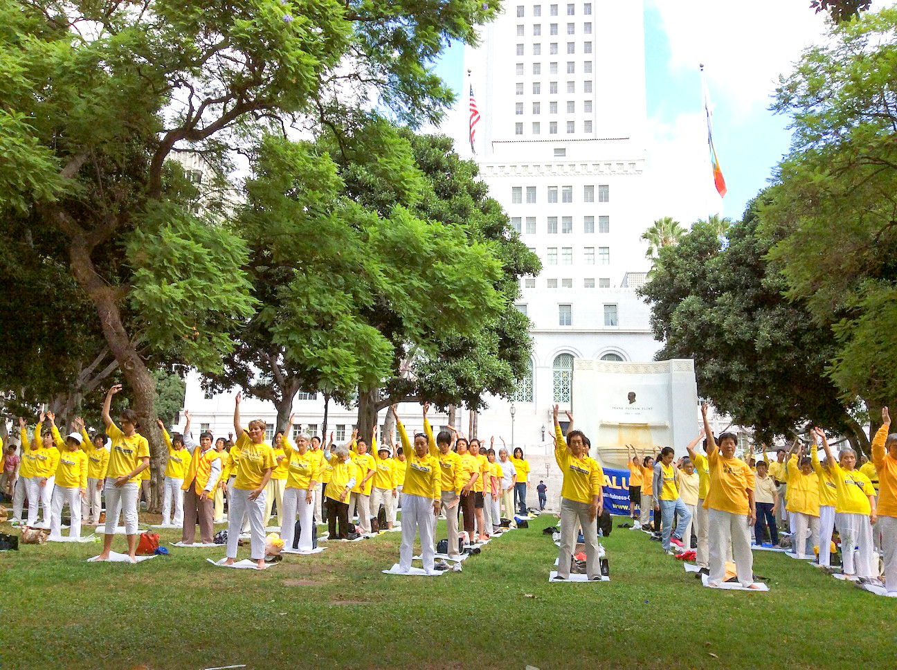 二零一五年十月十五日至十七日,来自不同国家的法轮功学员,汇集于美国洛杉矶,在自由的国土上展开各种讲真相活动,让世人知道法轮功的美好,呼吁人们制止对法轮功的迫害。其中活动之一于市政府前大炼功。