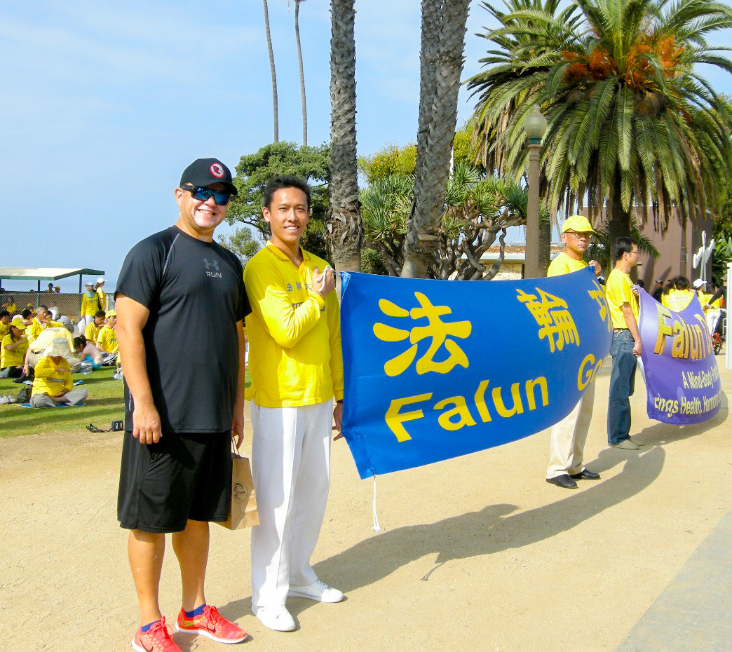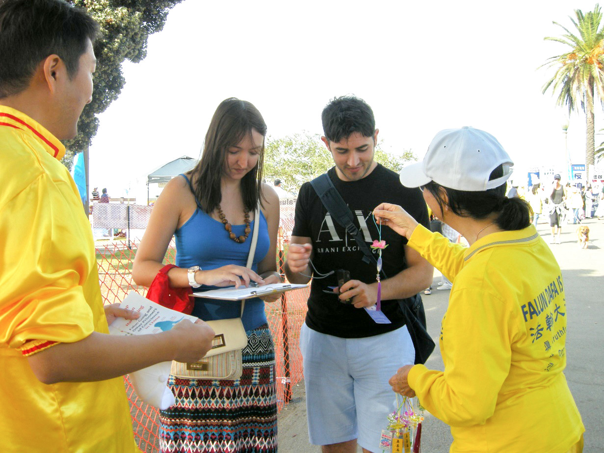 来自洛杉矶的电子工程师Anthony在现场跟法轮功学员交谈了很长时间,他表示非常有兴趣要学炼法轮功。