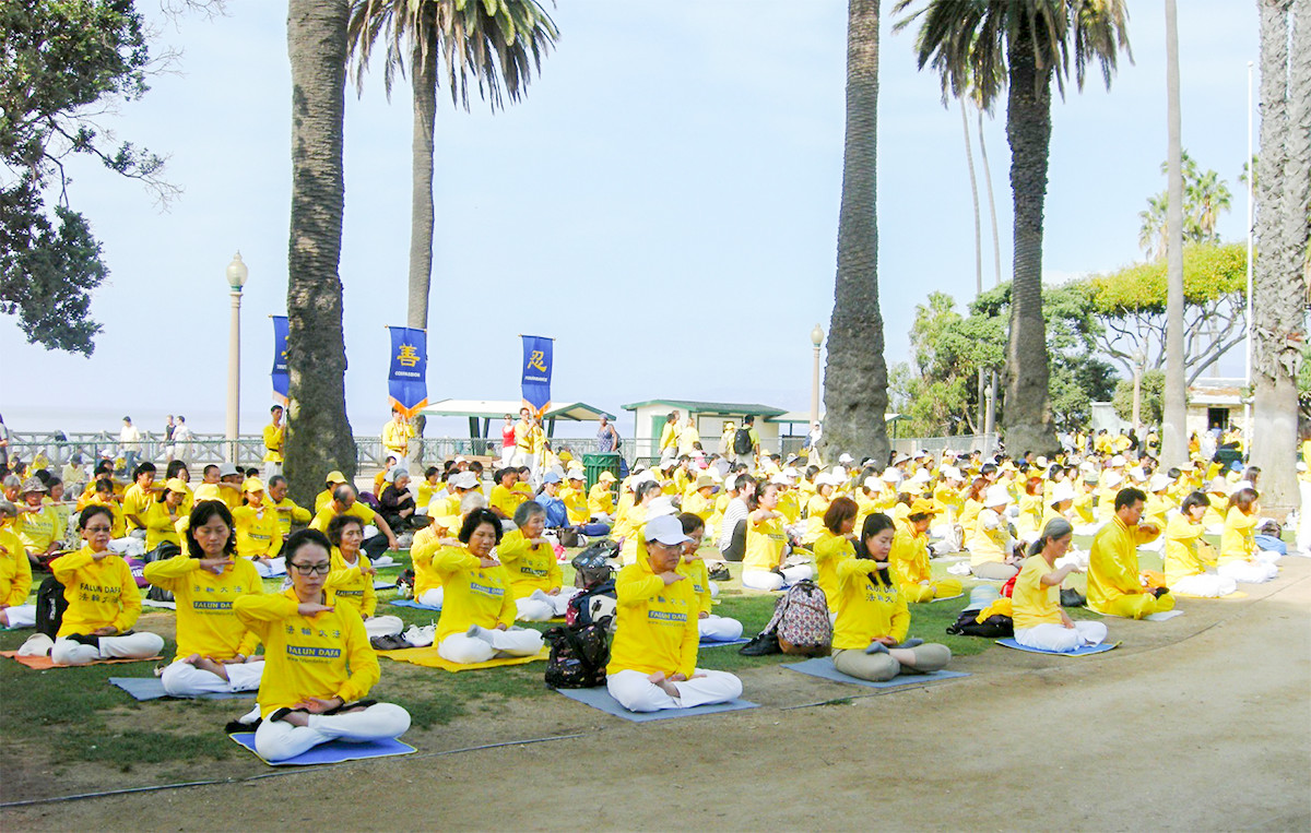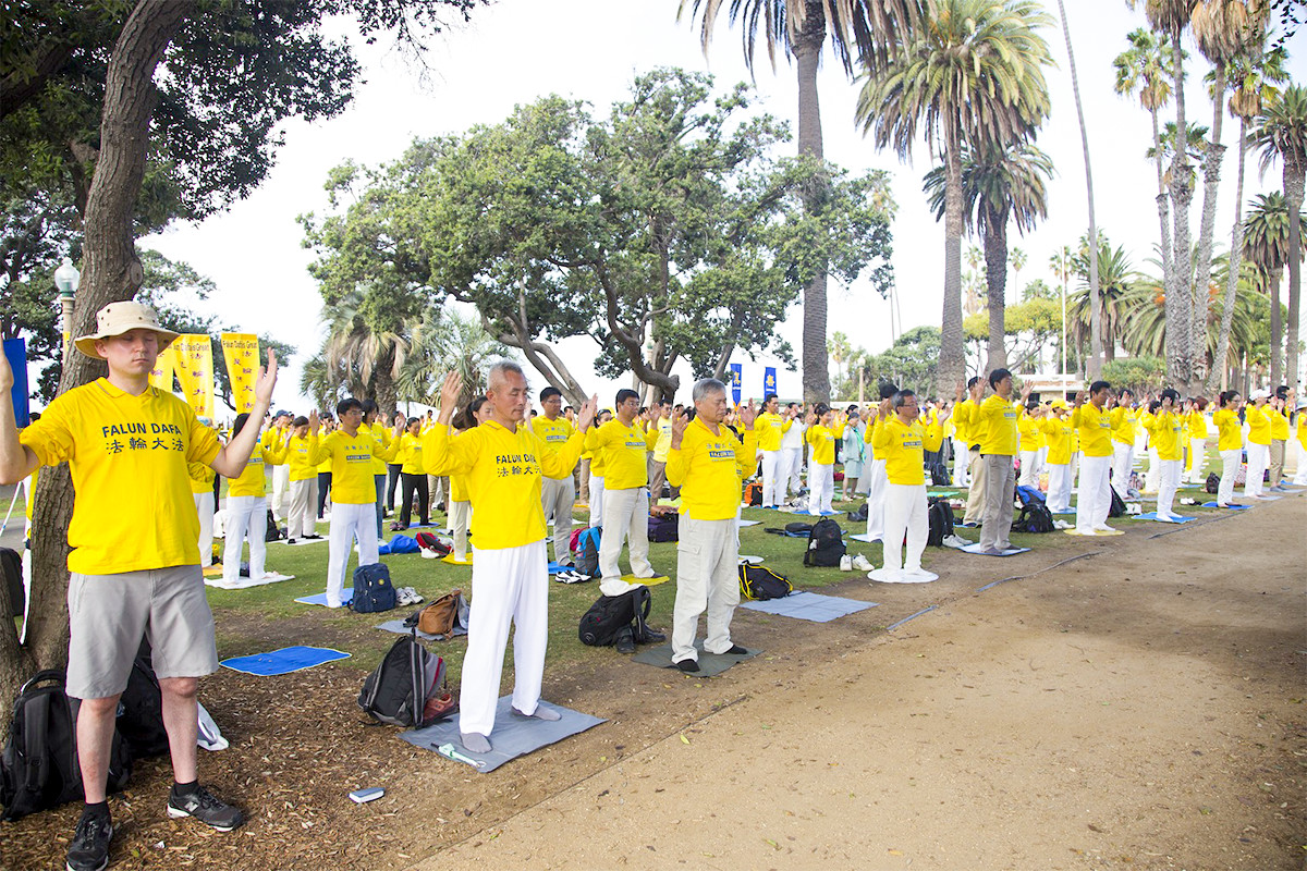 二零一五年十月十七日上午,数百名来自世界各地的法轮功学员,在圣塔莫尼卡海滩突堤码头(Santa Monica Pier)举行集体炼功和集会活动,在这个著名的景点传递法轮功真相,悠扬的音乐,祥和的炼功场面,令很多路人驻足观看,不少人表示要学炼法轮功。
