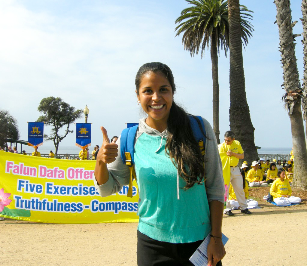 来自委内瑞拉的Baola拿着传单兴奋地说:“我第一次看到这么壮观的炼功场面。我看到的是非常美好的功法,我很感兴趣,如果我今天不是要上班,我一定会坐下来跟他们一起炼。我看到他们很放松和平静,很好的控制自己。我一定上网去学。”