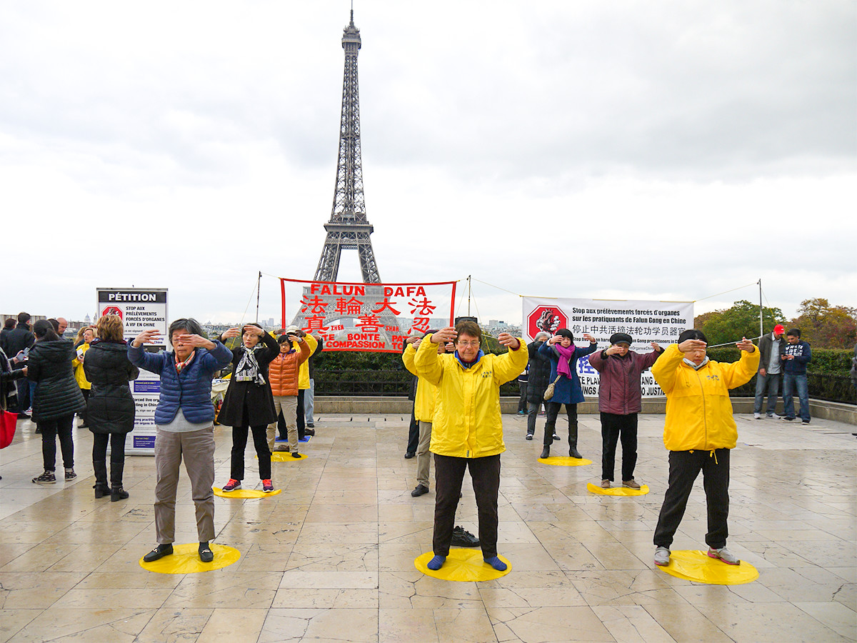 ![]() 图1:法轮功学员在巴黎艾菲尔铁塔下的人权广场上演示功法 |